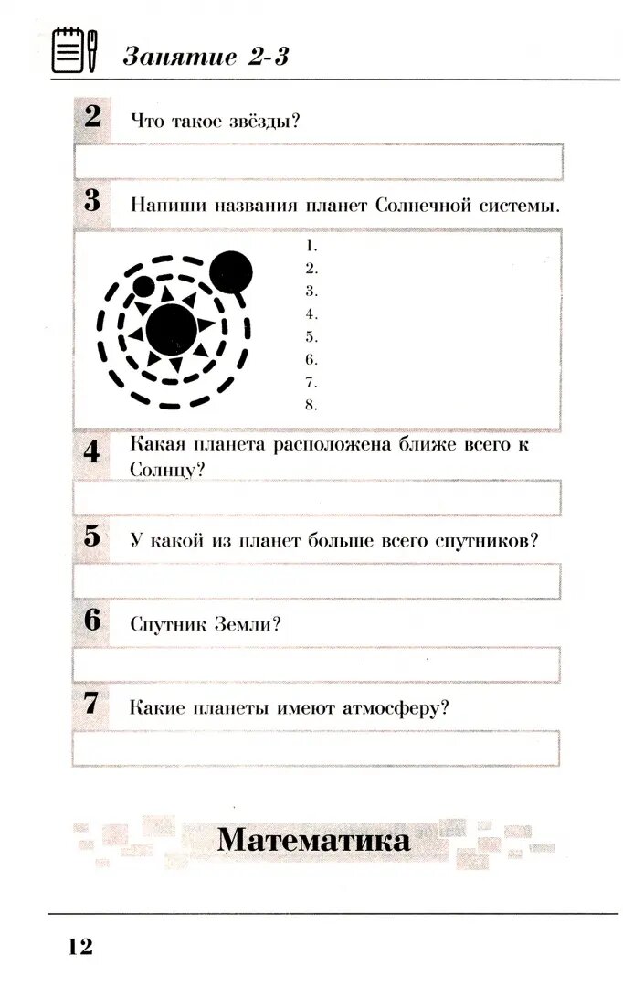 Для занятий на лето совершенно не подходит! Задания очень скучные, много попадается однотипных, особенно по русскому языку (постоянно предлагают считать гласные!). Места, выделенного для заполнения ответов по математике, очень часто не хватало. По окружающему миру вопросы то очень легкие, то очень сложные. В целом, очень негативное впечатление! Выкинули данное пособие, не сделав и две трети заданий!