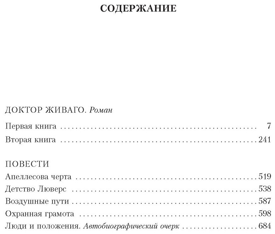 «Разве не лежит пропасть между прозой и поэзией? У Пастернака этой пропасти нет. Он объединял поэзию и прозу как единое искусство слова», — говорил академик Д. С. Лихачев. Ошеломляющая метафоричность, яркие образы и пронзительная одухотворенность — вот отличительные черты творчества Бориса Пастернака. Его произведения продолжают традиции русской и мировой классики, но при этом органично сочетают их с достижениями литературы Серебряного века и авангарда. В 1958 году Пастернак был удостоен Нобелевской премии по литературе «за значительные достижения в современной лирической поэзии, а также за продолжение традиций великого русского эпического романа». Для соотечественников присуждение премии оказалось прочно связано с романом «Доктор Живаго», опубликованным за рубежом. Политический скандал, вызванный этими событиями, быть может, стоил писателю жизни. В настоящее издание, помимо романа «Доктор Живаго», вошли повести «Апеллесова черта» (1918), «Детство Люверс» (1922), «Воздушные пути» (1924), «Охранная грамота» (1931), «Люди и положения» (1956), раскрывающие уникальный талант Пастернака-прозаика.