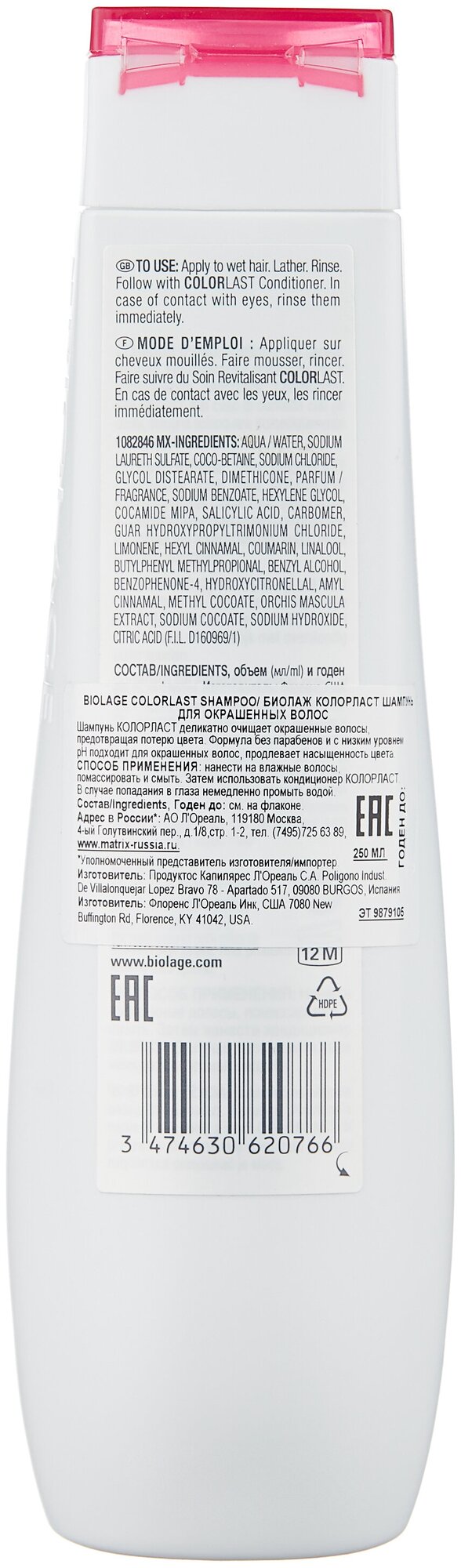 | Способ применения | Нанесите на волосы и распределите по всей длине. Вспеньте и тщательно смойте. При попадании в глаза немедленно промыть водой. Подходит для ежедневного использования.Для достижения оптимального результата и наилучшей защиты цвета окрашенных волос используйте другие средства гаммы Biolage Colorlast. |