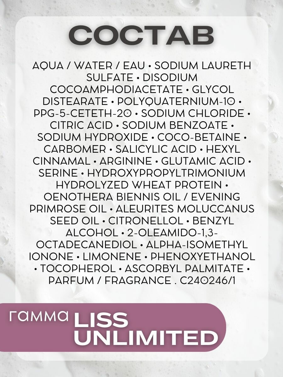 | Состав | aqua/water, sodium laureth sulfate, disodium cocoamphodiacetate, glycol distearate, polyquaternium-10, hexylene glycol, disodium ricinoleamido mea-sulfosucconate, sodium chloride, ceteareth-60 myristyl glycol, cocamide mea, sodium benzoate, salicylic acid, hexyl cinnamal, arginine, glutamic acid, butylphenyl methylpropional, serine, hydroxypropyl trimonium hydrolyzed wheat protein, oenothera biennis oil/evening primrose oil, aleurites moluccana nut oil/aleurites moluccana seed oil, benzyl alcohol, citronellol, 2-oleamido-1,3-octadecanediol, limonene, sodium hydroxide, citric acid, parfum/fragrance |
