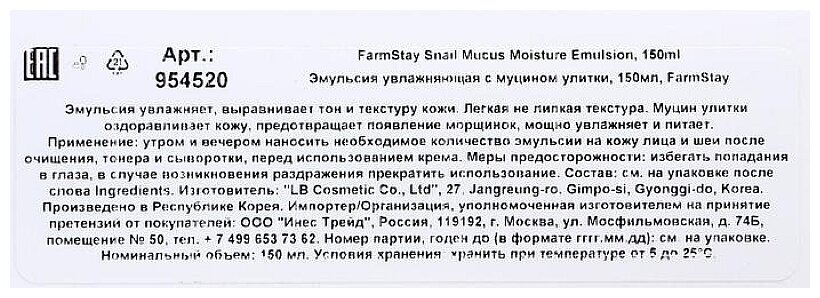 | Коллекция | FarmStay Snail Mucus Moisture Emulsion |