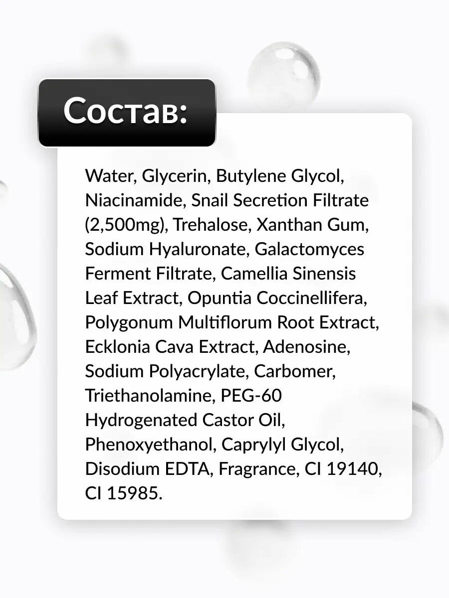 | Состав | вода, глицерин, бутиленгликоль, ниацинамид, фильтрат секреции улитки (2500мг), трегалоза, ксантановая камедь, гиалуроновая кислота, фильтрат фермента галактомицес, экстракт листа камелии китайской, экстракт опунции (кактус), экстракт горца многоцветкового, экстракт коричневых водорослей Ecklonia Cava, аденозин, натрия полиакрилат, карбомер, триэтаноламин, ПЭГ-60 гидрогенизированное касторовое масло, феноксиэтанол, каприлилгликоль, динатрия ЭДТА, ароматизатор, Cl 19140, Cl 159854 |