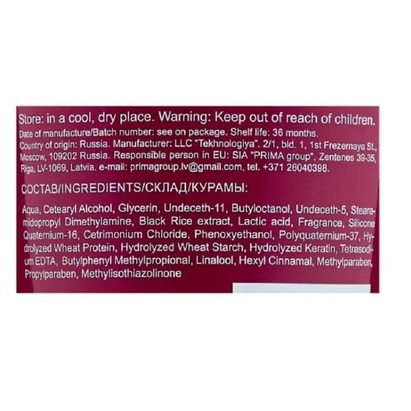 | Состав | Aqua, Cetearyl Alcohol, Propylene Glycol, Glycerin, Stearamidopropyl Dimethylamine, Silicone Quaternium-16, Undeceth-11, Butyloctanol, Undeceth-5, Polyquaternium-37, Phenoxyethanol, Ethylhexylglycerin, Cetrimonium Chloride, Tetrasodium EDTA, Hydrolyzed Keratin, Hydrolyzed Wheat Protein, Hydrolyzed Wheat Starch, Black Rice Extract, Lactic Acid, Parfum, Butylphenyl Methylpropional, Linalool, Hexyl Cinnamal, Coumarin, Alpha-Isomethyl Lonone |