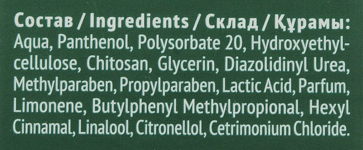 | Состав | Aqua, Panthenol, Hydroxyethylcellulose, Chitosan, Glycerin, Propylene Glycol, Diazolidinyl Urea, Methylparaben, Propylparaben, Lactic Acid, PEG?40 Hydrogenated Castor Oil, Parfum, Limonene, Linalool, Citronellol, Geraniol, Cetrimonium Сhloride. |
