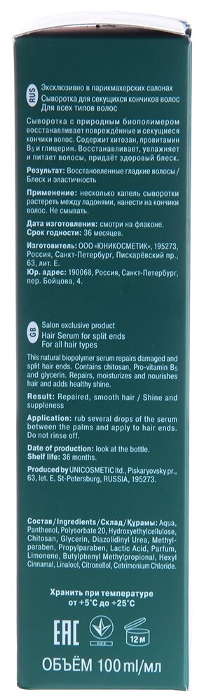 Сыворотка с природным биополимером восстанавливает поврежденные и секущиеся кончики волос. Содержит хитозан, провитамин В5 и глицерин. Восстанавливает, увлажняет и питает волосы, придает здоровый блеск.