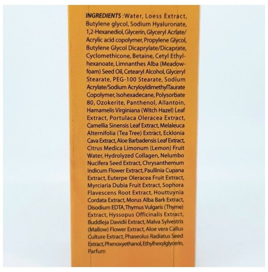 | Состав | Water, Loess Extract, Butylene glycol, Sodium Hyaluronate,1,2-Hexanediol, Glycerin, Glyceryl Acrlate/Acrylic acid copolymer, Propylene Glycol, Butylene Glycol Dicaprylate/Dicaprate, Cyclomethicone, Betaine, Cetyl Ethylhexanoate, Limnanthes Alba (Meadowfoam) Seed Oil, Cetearyl Alcohol, Glyceryl Stearate, PEG-100 Stearate, Sodium Acrylate/Sodium AcryloyldimethylTaurate Copolymer, Isohexadecane, Polysorbate 80, Glyceryl Stearate, Ozokerite, Panthenol, Allantoin, Hamamelis Virginiana (Witch Hazel) Leaf Extract, Portulaca Oleracea Extract, Camellia Sinensis Leaf Extract, Melaleuca Alternifolia (Tea Tree) Extract, Ecklonia Cava Extract, Aloe Barbadensis Leaf Extract, Citrus Medica Limonum (Lemon) Fruit Water, Hydrolyzed Collagen, Nelumbo Nucifera Seed Extract, Chrysanthemum Indicum Flower Extract, Paullinia Cupana Extract, Euterpe Oleracea Fruit Extract, Sophora Flavescens Root Extract, Houttuynia Cordata Extract, Morus Alba Bark Extract, Disodium EDTA, Thymus Vulgaris (Thyme) Extract, Hyssopus Officinalis Extract |