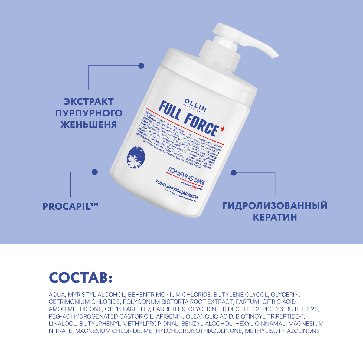 | Активные компоненты | гидролизованный кератин, прокапил, экстракт пурпурного женьшеня |