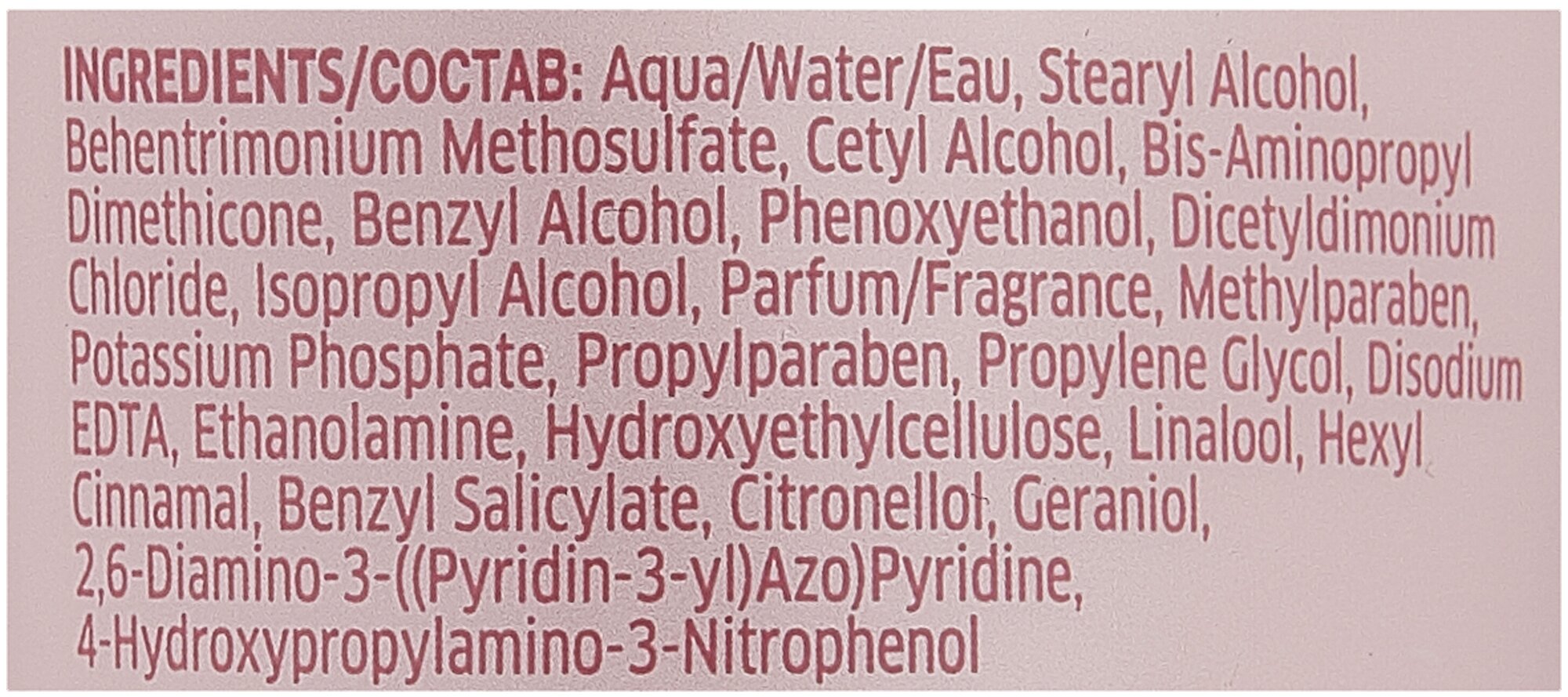 | Состав | aqua, stearyl alcohol, behentrimonium methosulfate, cetyl alcohol, bis-aminopropyl dimethicone, benzyl alcohol, phenoxyethanol, dicetyldimonium chloride, isopropyl alcohol, parfum, methylparaben, potassium phosphate, propylparaben, propylene glycol, disodium edta, ethanolamine, hydroxyethylcellulose, linalool, hexyl cinnamal, benzyl salicylate, citronellol, geraniol, pyridine, 4-hydroxypropylamino-3-nitrophenol. |