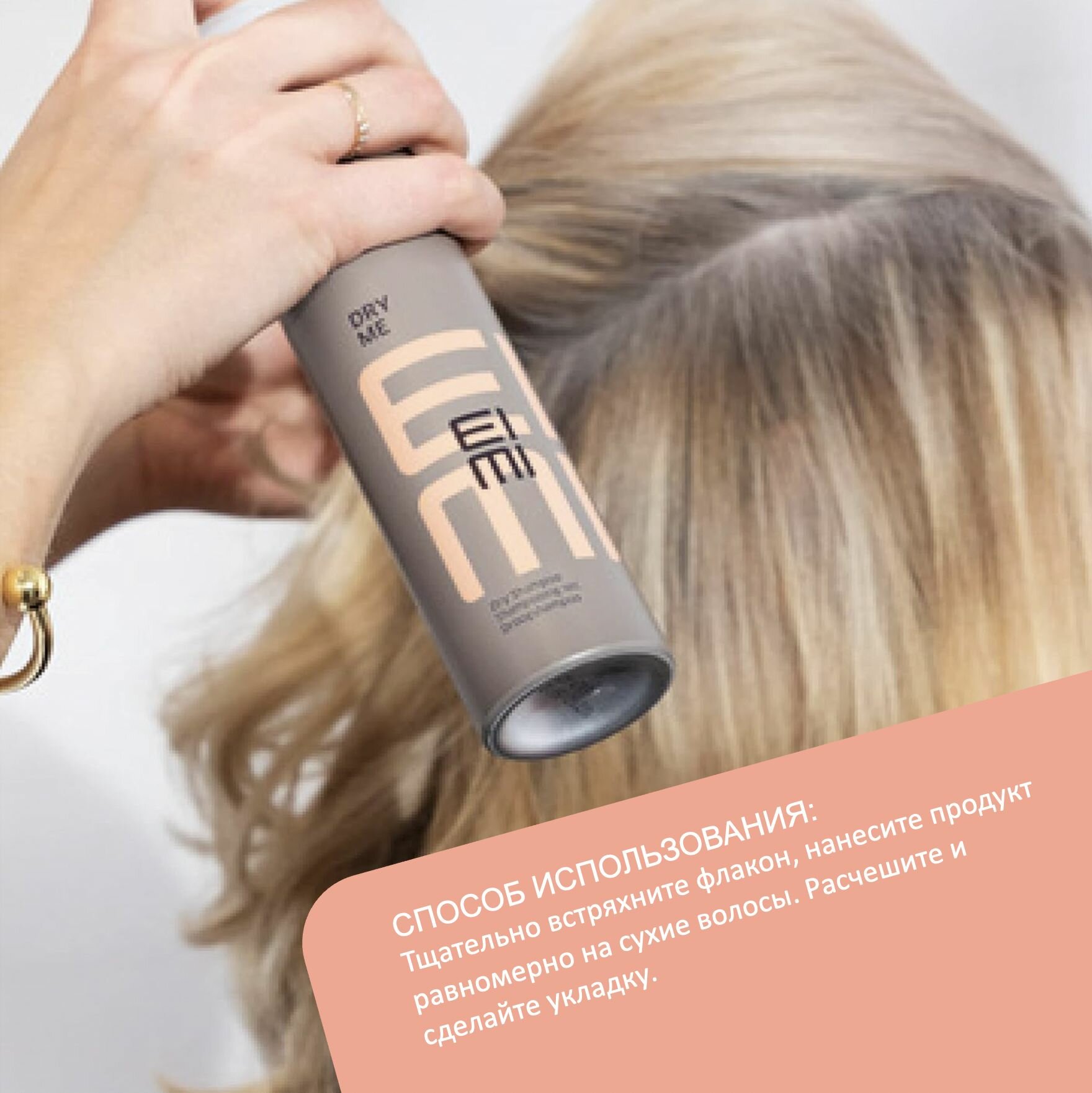 Тщательно встряхните флакон. Нанесите продукт равномерно на сухие волосы. Расчешите и сделайте укладку.