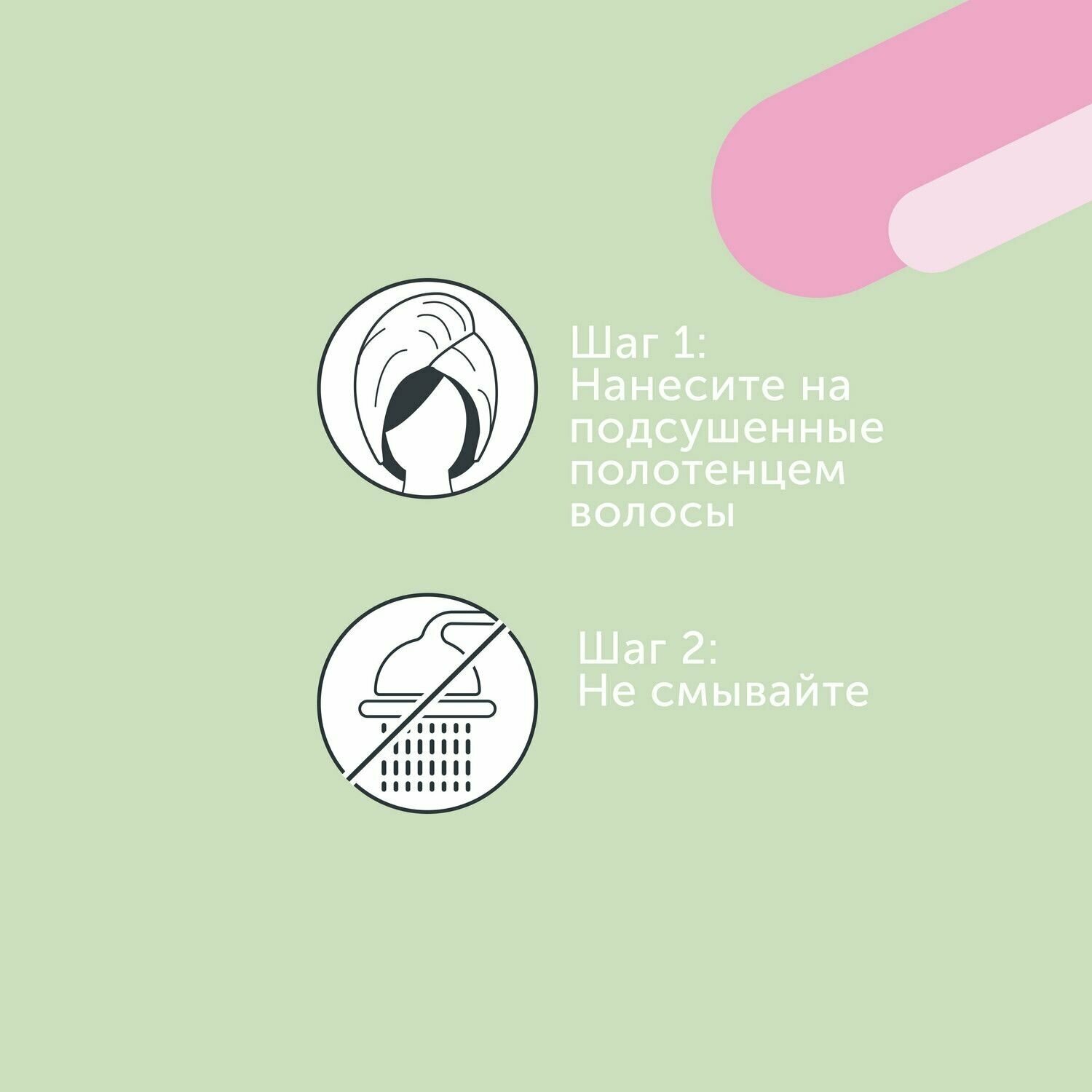 Нанести на подсушенные полотенцем волосы. Не смывать. Избегать попадания в глаза.