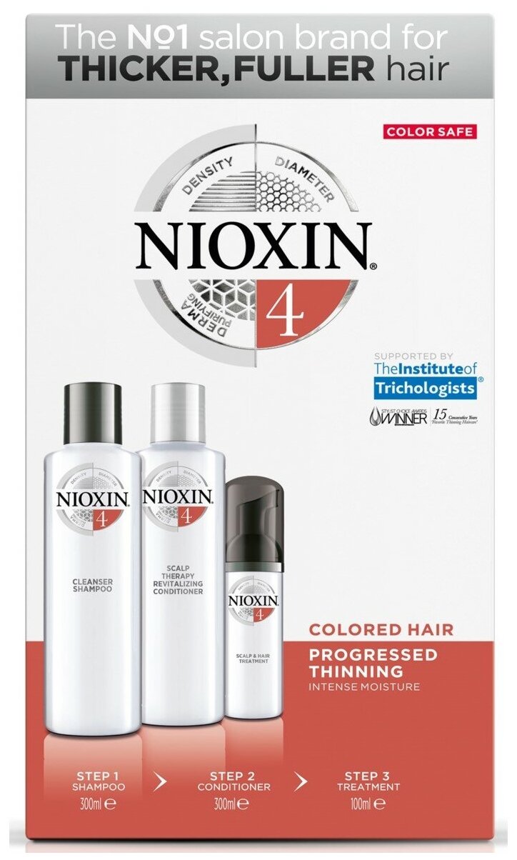 Придание волосам визуальной густоты и объема, а также восстановление баланса влажности при помощи 3-ступенчатой системы Nioxin System 4 для окрашенных, истонченных волос. Система включает в себя три продукта, которые укрепляют волосы, предотвращая их выпадение и повреждение кутикулы, а также придает им густой вид. 3-х ступенчатая система создана для очищения, увлажнения и питания окрашенных волос, с сохранением их цвета. Очищающий шампунь Nioxin (150 мл): удаляет себум и другие загрязнения с волос и кожи головы. Увлажняющий кондиционер для кожи головы и волос Nioxin (150 мл): легкий кондиционер восстанавливает упругость волос, помогает контролировать баланс увлажнения кожи головы и волос. Питательная маска (40 мл): предотвращает выпадение волос из-за повреждения кутикулы, обеспечивая восстановление кожи головы