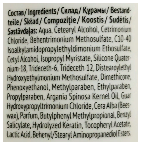 | Состав | aqua, cetearyl alcohol, cetrimonium chloride, behentrimonium methosulfate, c10-40 isoalkylamidopropylethyldimonium ethosulfate, cetyl alcohol, isopropyl myristate, water (and) silicone quaternium-18 (and) trideceth-6 (and) trideceth-12, distearoylethyl hydroxyethylmonium methosulfate, dimethicone, phenoxyethanol, methylparaben, ethylparaben, propylparaben, argania spinosa kernel oil, guar hydroxypropyltrimonium chloride, cera alba (beeswax), parfum, butylphenyl methylpropional, benzyl salicylate, hydrolyzed keratin, tocopheryl acetate, lactic acid, behenyl / stearyl aminopropanediol esters |