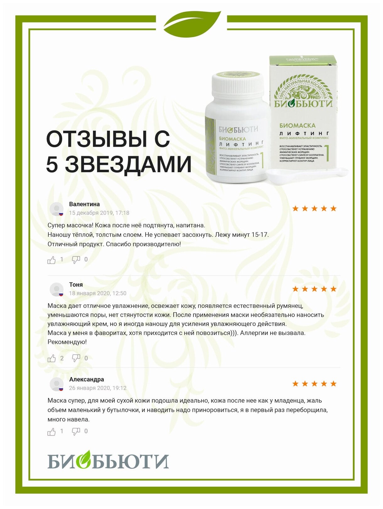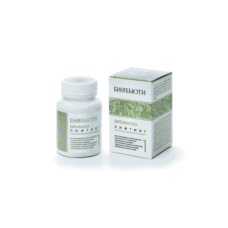 Сухая биомаска Биобьюти №1 Лифтинг используется для омоложения увядающей кожи, для поддержания ее упругости, а также для насыщения и питания кожи лица витаминами и минералами. Маска для лица Биобьюти №1 с лифтинг эффектом подтягивает кожу и укрепляет ее, она улучшает контур лица и выравнивает цвет кожи. Компоненты маски запускают регенерацию клеток, ускоряют обменные процессы, за счет чего лицо обретает здоровых и свежий вид. После использования маски кожа начинает «дышать», чувствуется ее мягкость и нежность. Биомаска Биобьюти №1 «Лифтинг» представляет собой сухую смесь полезных и лечебных компонентов, измельченных по особой технологии. В состав маски входят листья, коренья и плоды трав и растений, минералы и злаки. Среди большого количества лечебных растений в составе маске есть листья березы, действие которых направлено на активацию синтеза коллагена и эластина – они необходимы увядающей и уставшей коже. Корень радиолы розовой нормализует обменные процессы в клетках кожи. Шишки хмеля укрепляют капилляры, способствуют нормализации водного баланса и жирообменных процессов кожи. Соли стимулируют кровообращение, цеолиты активируют полезные свойства компонентов маски. Кожа после маски становится гладкой и бархатистой, устраняется сухость, покраснения и шелушения. Морщины разглаживаются уже после нескольких применений, лицо выглядит молодым, свежим и отдохнувшим. Натуральная Лифтинг маска в домашних условиях оказывает отличное омолаживающее действие. Перед тем, как ее использовать, необходимо очистить кожу от макияжа, частиц грязи, пыли и жира. Рекомендуем использовать для очищения кожи Биочистку или скраб FRESH FAC. Завершающим этапом ухода за кожей лица станет использование крема Биобьюти.