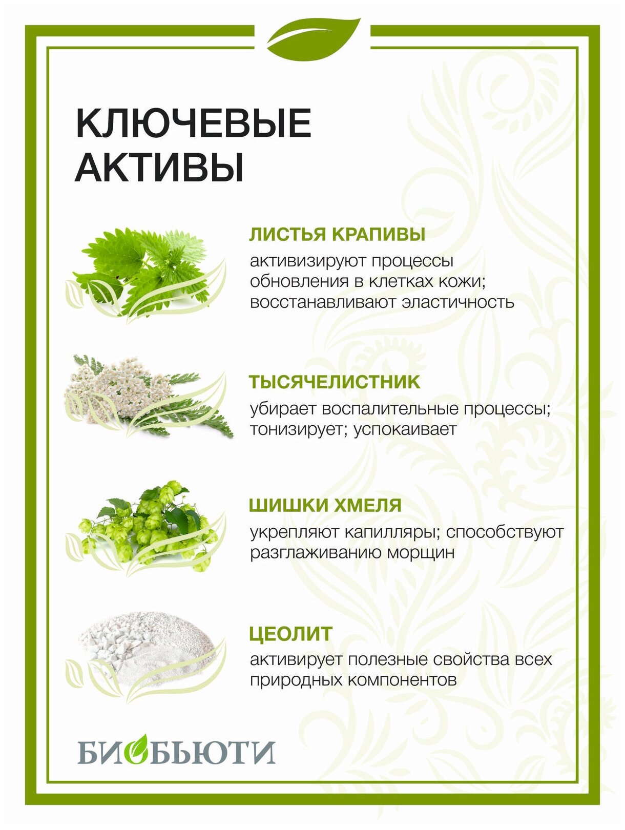 | Активные компоненты | - Природный цеолит; - каолиновые глины; - соль Мертвого моря; - медь; - ржаные отруби; - пшеничные отруби; - овсяные отруби; - листья березы; - листья крапивы; - листья калины; - шишки хмеля; - корень родиолы розовой; - корень имбиря; - цветки бузины черной; - цветки василька синего; - ламинария; - тысячелистник; - семена льна; - липовый цвет; - |