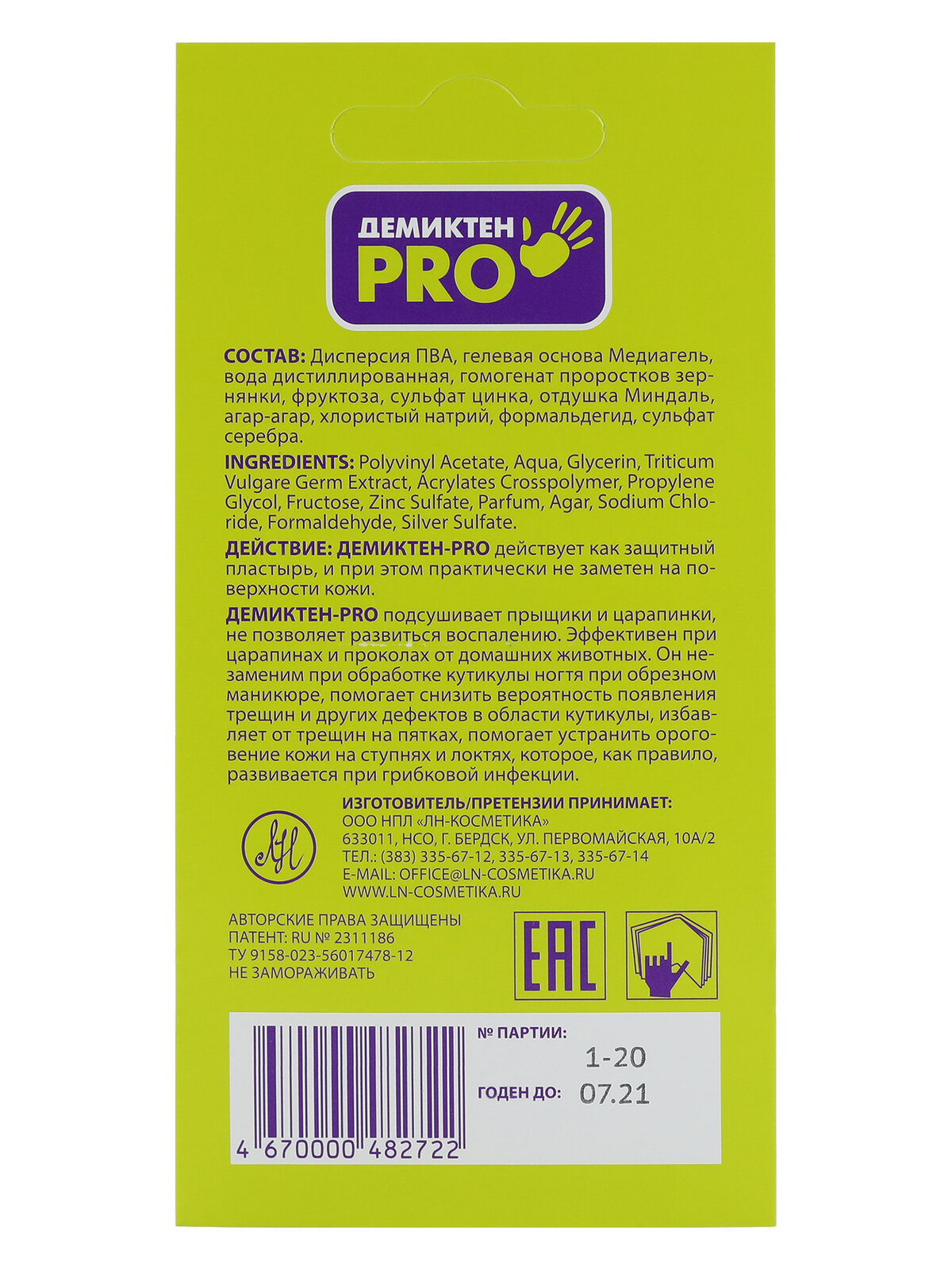 Демиктен при обрезном маникюре и педикюре. Демиктен хорошо действует, если при обрезном маникюре\педикюре получился порез — его можно использовать как невидимый пластырь на поврежденном месте — он препятствует возникновению заражения и воспаления. Демиктен подавляет быстрый рост кутикулы, поэтому его можно нанести на кутикулу и ноготь после обрезного маникюра, а декоративный лак нанести сверху.