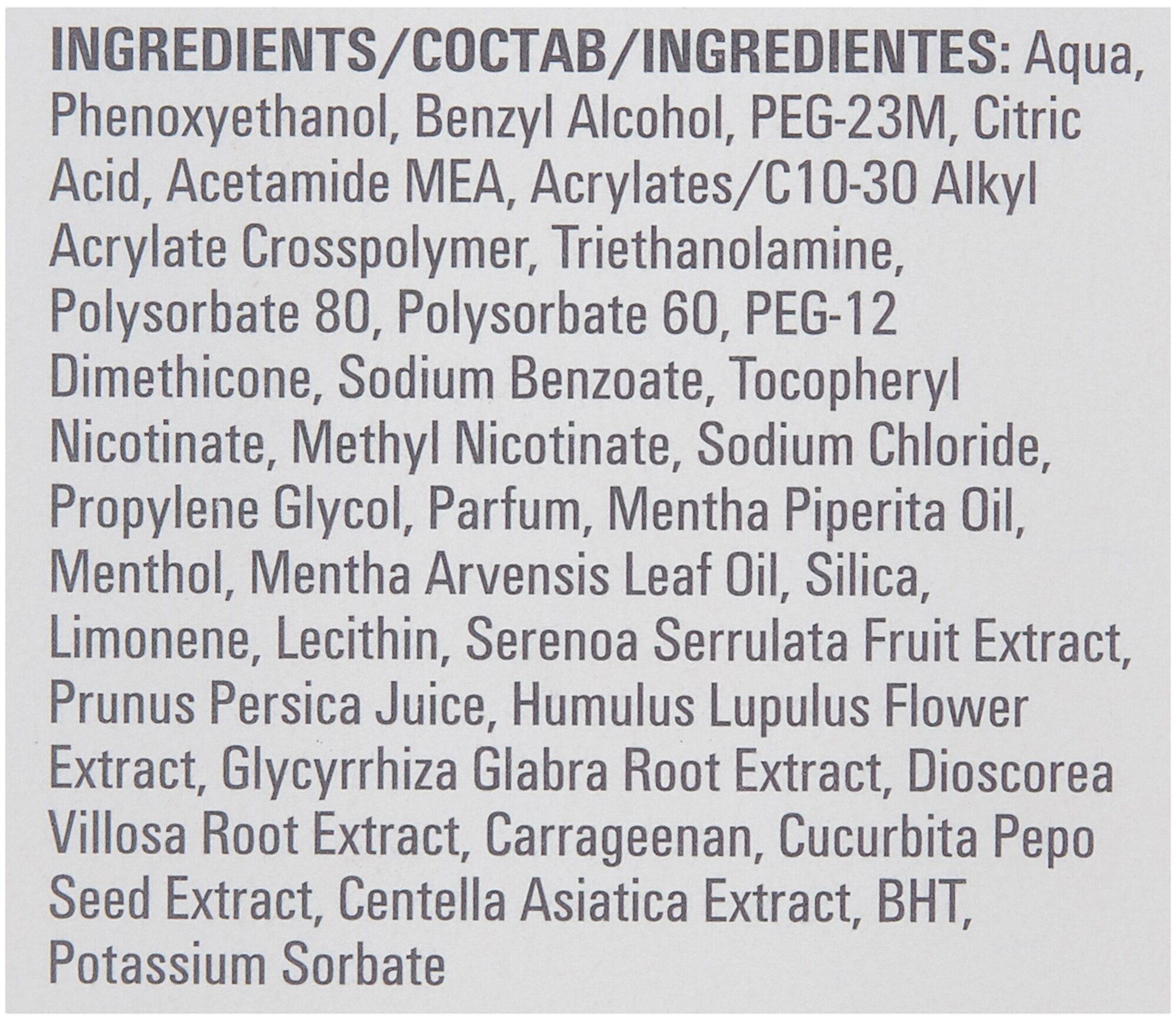 | Состав | aqua, phenoxyethanol, benzyl alcohol, peg-23m, citric acid, acetamide mea, acrylates/c10-30 alkyl acrylate crosspolymer, triethanolamine, polysorbate 80, polysorbate 60, peg-12 dimethicone, sodium benzoate, tocopheryl nicotinate, methyl nicotinate, sodium chloride, propylene glycol, parfum, mentha piperita oil, menthol, mentha arvensis leaf oil, silica, limonene, lecithin, serenoa serrulata fruit extract, prunus persica juice, humulus lupulus flower extract, glycyrrhiza glabra root extract, dioscorea villosa root extract, carrageenan, cucurbita pepo seed extract, centella asiatica extract, bht, potassium sorbate |