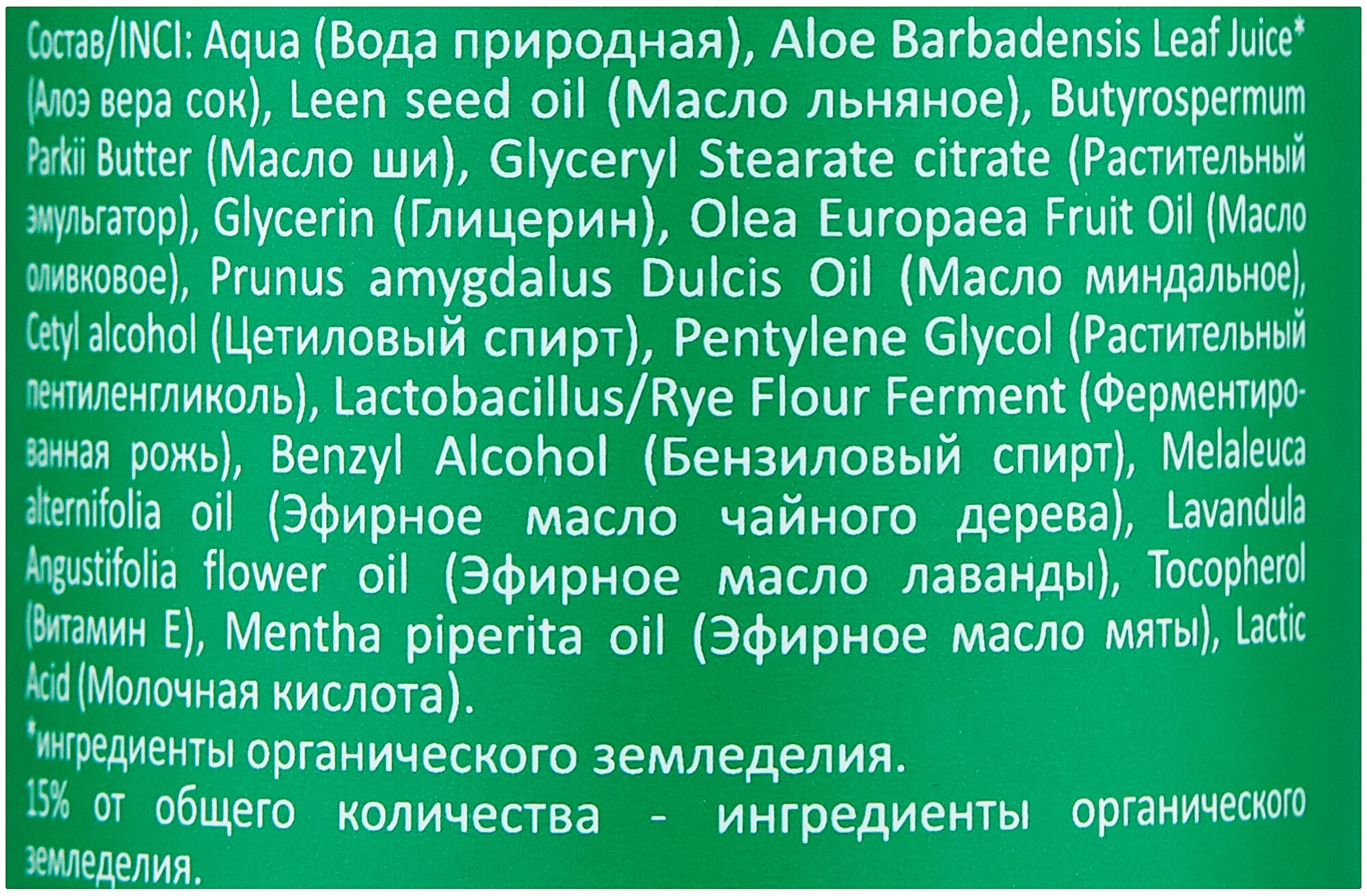 Состав: aqua (вода), aloe barbadensis leaf juice (алоэ вера гель), leen seed oil (масло льняное), butyrospermum parkii butter (масло ши), glyceryl stearate citrate (растительный эмульгатор), glycerin (глицерин), olea europaea fruit oil (масло оливковое), prunus amygdalus dulcis oil (масло миндальное), cetyl alcohol (цетиловый спирт), pentylene glycol (растительный пентиленгликоль), lactobacillus/rye flour/ferment (ферментированная рожь), benzyl alcohol (бензиловый спирт), melaleuca alternifolia oil (эфирное масло чайного дерева), lavandula angustifolia flower oil (эфирное масло лаванды), tocopherol (витамин e), mentha arvensis oil (эфирное масло мяты), sodium benzoate (натрия бензоат), lactic acid (молочная кислота), potassium sorbate (калия сорбат)