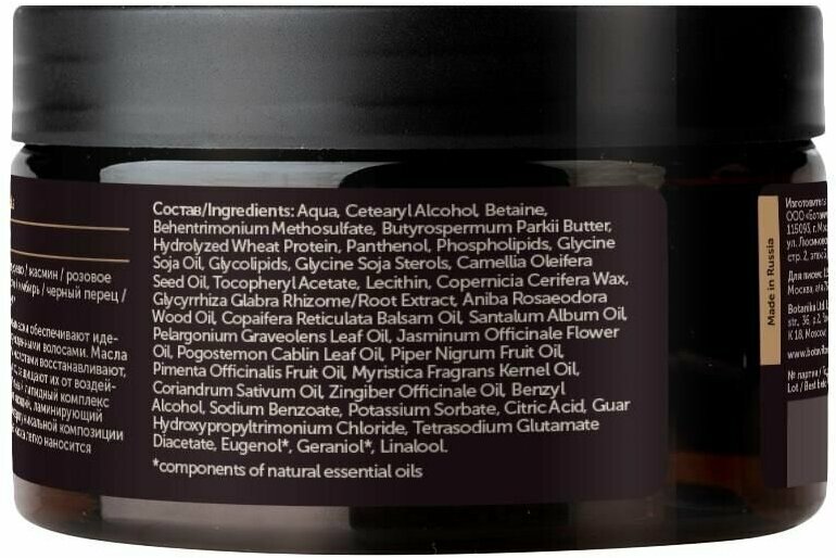 | Химический состав | Aqua, Cetearyl Alcohol, Betaine, Behentrimonium Methosulfate, Butyrospermum Parkii Butter, Phospholipids, Glycine Soja (Soybean) Oil, Glycolipids, Glycine Soja (Soybean) Sterols, Camellia Oleifera Seed Oil, Tocopheryl Acetate, Lecithin, Benzyl Alcohol, Benzoic Acid, Sorbic Acid, Citric Acid, Copernicia Cerifera (Carnauba) Wax, Guar Hydroxypropyltrimonium Chloride, Glycyrrhiza Glabra Rhizome/Root Extract, Aniba Rosaeodora Wood Oil, Copaifera Reticulata Balsam Oil, Santalum Album Oil, Pelargonium Roseum Leaf Oil, Jasminum Officinale Flower Oil, Pogostemon Cablin Leaf Oil, Piper Nigrum Fruit Oil, Pimenta Officinalis Fruit Oil, Myristica Fragrans Kernel Oil, Coriandrum Sativum Oil, Zingiber Officinale Oil, Linalool*, Citronellol*, Limonene*, Geraniol*, Hexylcinnamal* |