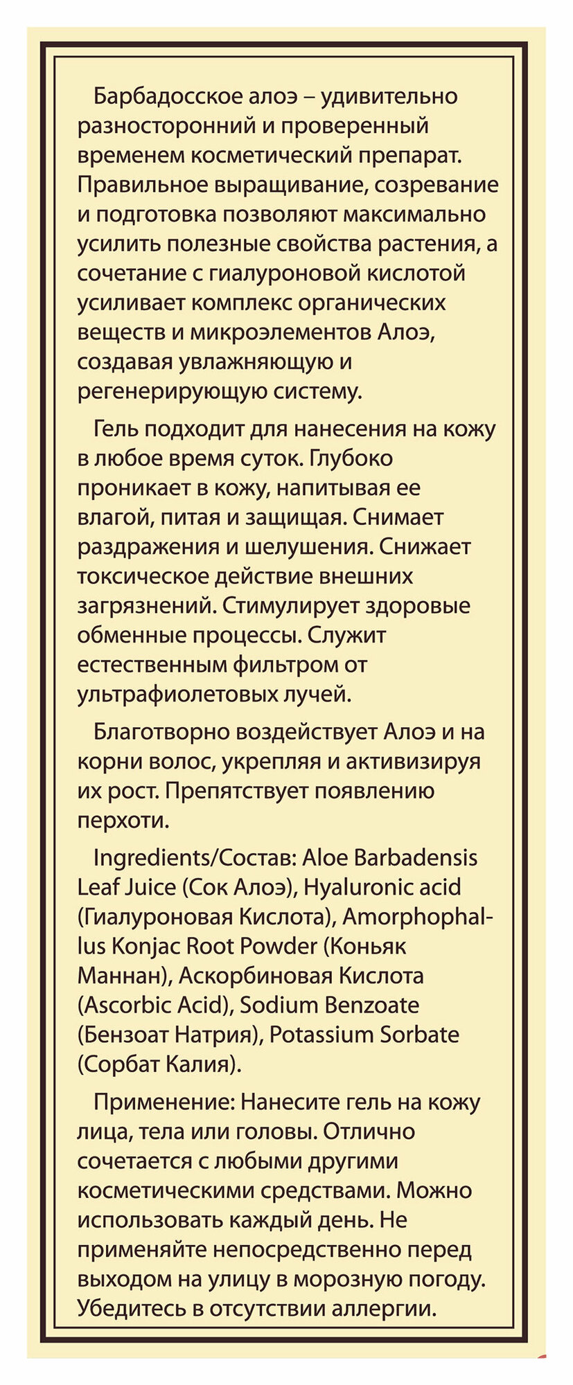 Барбадосское алоэ – удивительно разносторонний и проверенный временем косметический препарат. Правильное выращивание, созревание и подготовка позволяют максимально усилить полезные свойства растения, а сочетание с гиалуроновой кислотой усиливает комплекс органических веществ и микроэлементов Алоэ, создавая увлажняющую и регенерирующую систему. Гель подходит для нанесения на кожу в любое время суток. Глубоко проникает в кожу, напитывая ее влагой, питая и защищая. Снимает раздражения и шелушения. Снижает токсическое действие внешних загрязнений. Стимулирует здоровые обменные процессы. Служит естественным фильтром от ультрафиолетовых лучей. Благотворно воздействует Алоэ и на корни волос, укрепляя и активизируя их рост. Препятствует появлению перхоти.