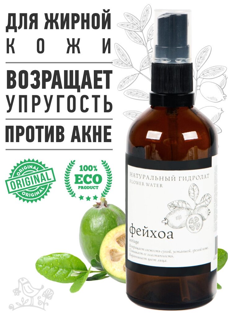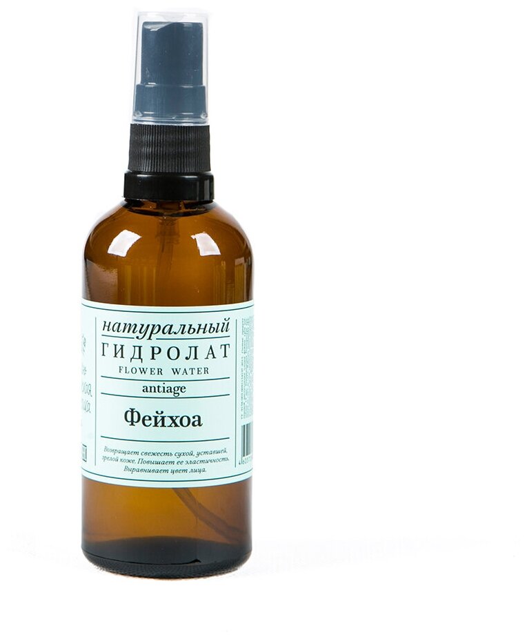 Гидролат Фейхоа (цветочная вода) –продукт паровой дистилляции (выпаривания) плодов фейхоа. Собранный конденсат пара - это целебная жидкость, которая содержит водорастворимые полезные компоненты растения. Для ухода за жирной кожей. Также помогает вернуть свежесть зрелой уставшей коже.