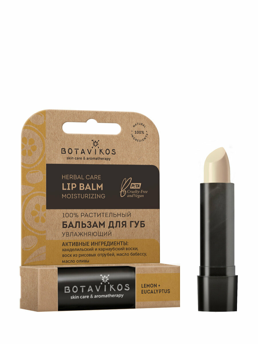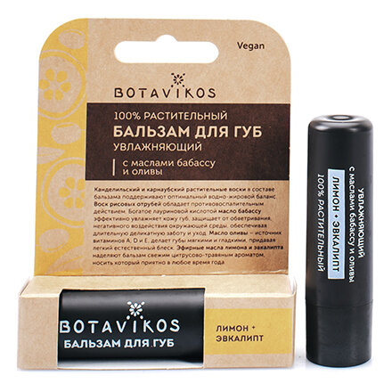 | Полное наименование | Botavikos Бальзам для губ Увлажняющий бабассуолива с ароматом лимона и эвкалипта 4 г |