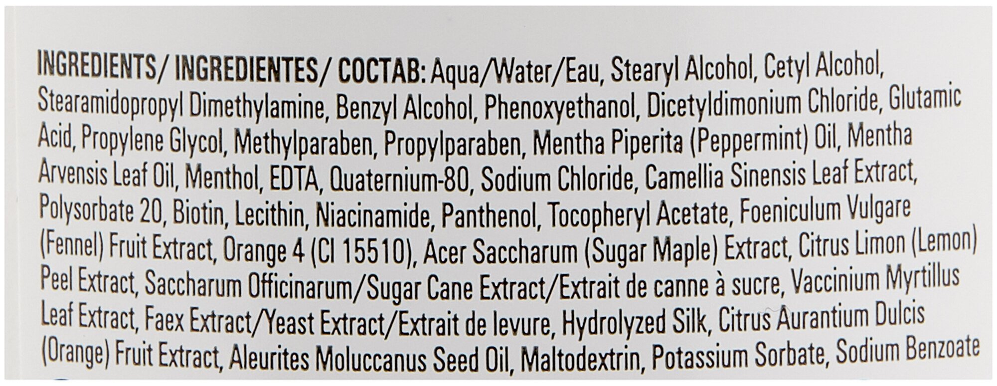 Состав: aqua, stearyl alcohol, cetyl alcohol, stearamidopropyl dimethylamine, phenoxyethanol, benzyl alcohol, dicetyldimonium chloride, glutamic acid, bis-aminopropyl dimethicone, propylene glycol, methylparaben, propylparaben, mentha piperita oil, mentha arvensis leaf oil, menthol, edta, sodium chloride, camellia sinensis leaf extract, polysorbate 20, biotin, lecithin, niacinamide, panthenol, tocopheryl acetate, foeniculum vulgare fruit extract, cl 15510, faex extract, acer saccharum extract, citrus limon peel extract, saccharum officinarum extract, vaccinium myrtillus leaf extract, hydrolyzed silk, citrus aurantium dulcis fruit extract, aleurites moluccana seed oil, potassium sorbate, sodium benzoate