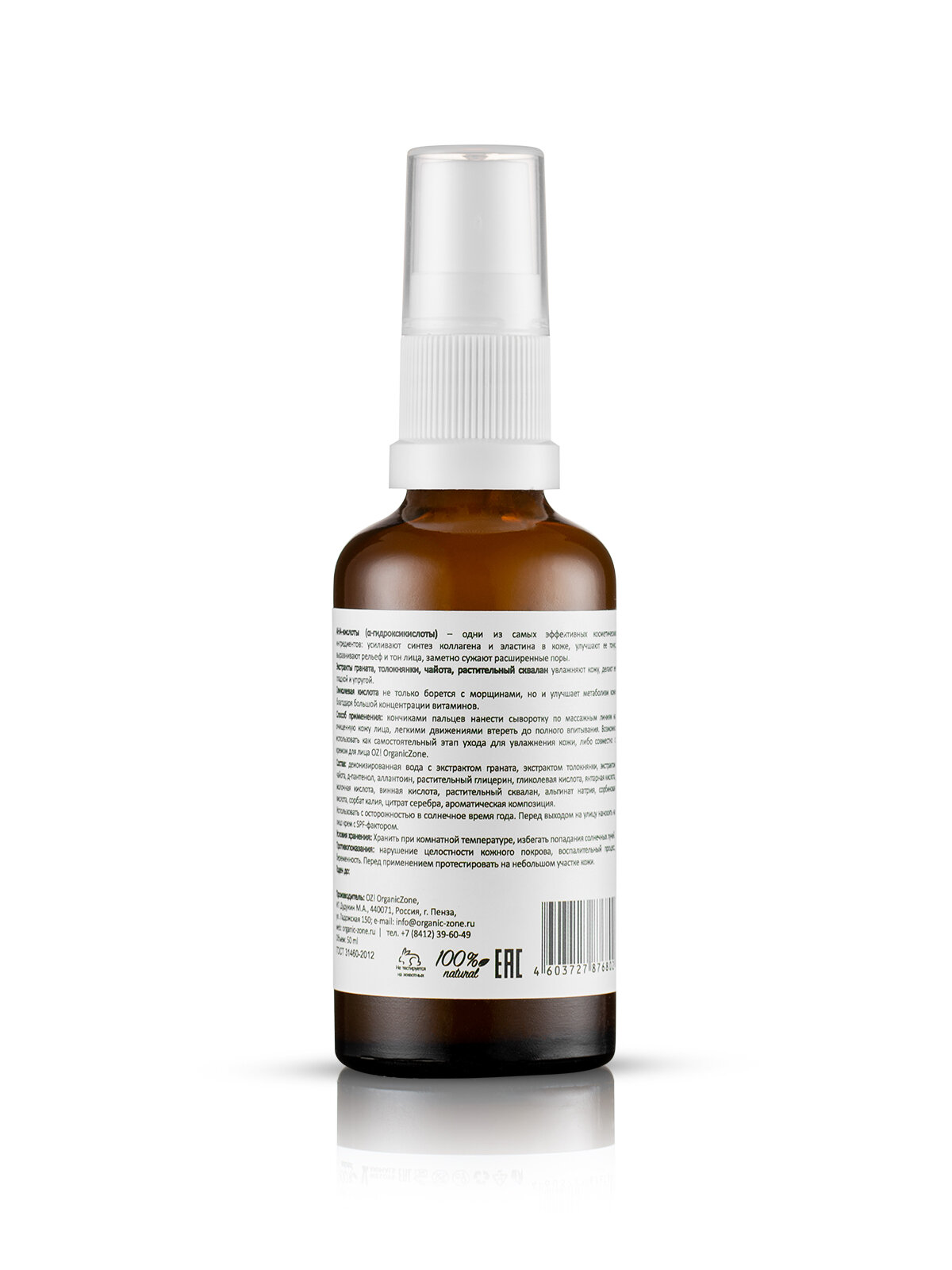 | Состав | деионизированная вода с экстрактом граната, экстрактом толокнянки, экстрактом чайота, д-пантенол, аллантоин, растительный глицерин, гликолевая кислота, янтарная кислота, молочная кислота, винная кислота, растительный сквалан, альгинат натрия, сорбиновая кислота, сорбат калия, цитрат серебра, ароматическая композиция. |
