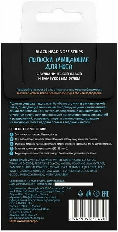 | Способ применения | Очистите кожу от макияжа. Не вытирайте ее. Отделите полоску от защитной пленки. Приложите полоску к носу глянцевой стороной. Влажными пальцами тщательно прижмите полоску к коже: это необходимо для лучшего прилегания. Дождитесь полного высыхания полоски (10 - 15 минут). Аккуратно удалите полоску от краев к центру. Смойте остатки угольной пудры водой. |