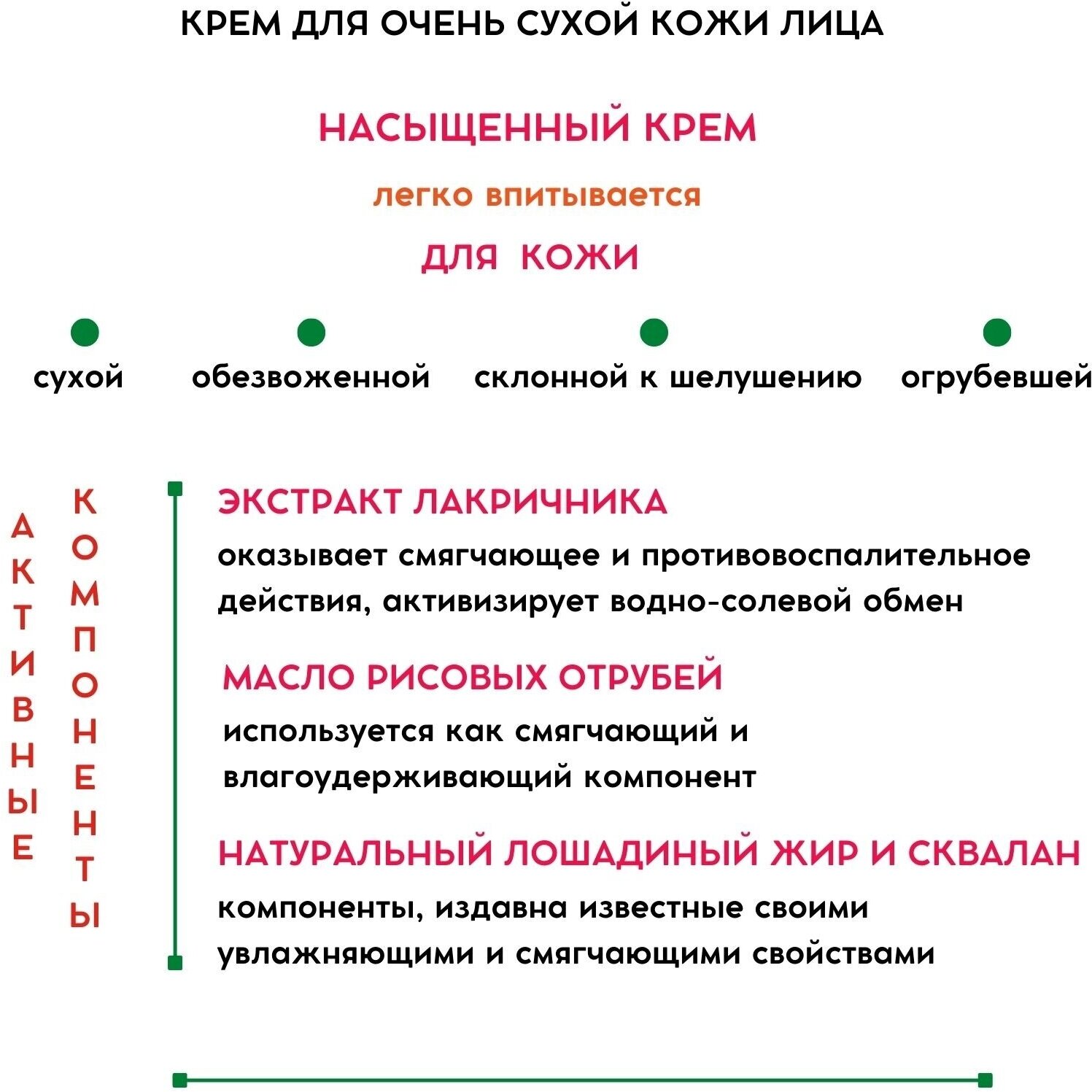 Насыщенный крем особенно рекомендуется для сухой и склонной к шелушению, а также обезвоженной и огрубевшей кожи. Крем обеспечивает кожу насыщенным постоянным увлажнением, смягчает, поддерживает упругость и эластичность, повышает защитные свойства кожи. Легко впитывается. Экстракт лакричника - оказывает смягчающее и противовоспалительное действия, активизирует водно-солевой обмен. Масло рисовых отрубей - используется как смягчающий и влагоудерживающий компонент. Натуральный лошадиный жир и сквалан - компоненты, издавна известные своими увлажняющими и смягчающими свойствами. Крем избавляет от ощущения стянутости кожи после умывания. Может также использоваться для огрубевших участков кожи пальцев рук и тыльной стороны ладоней.