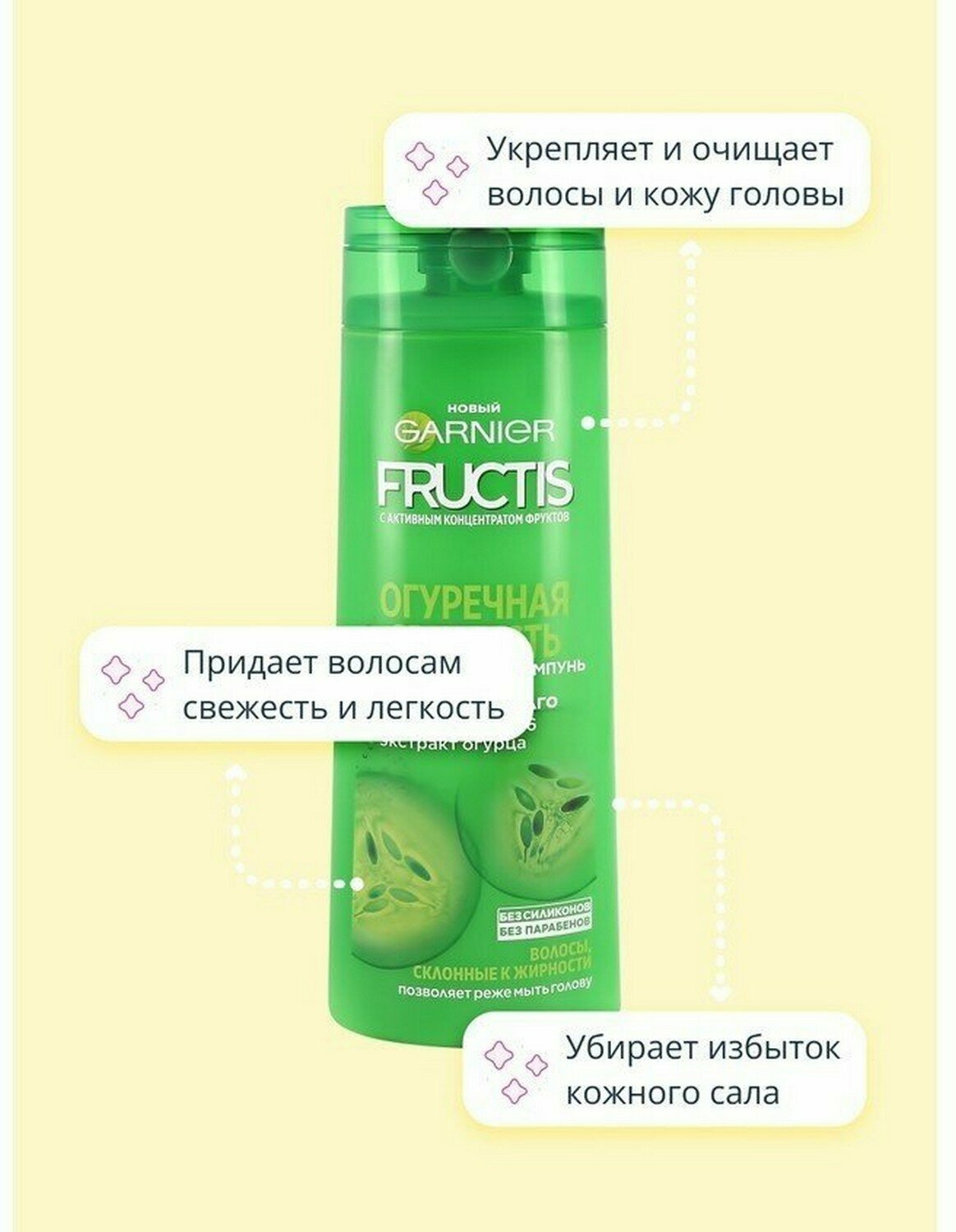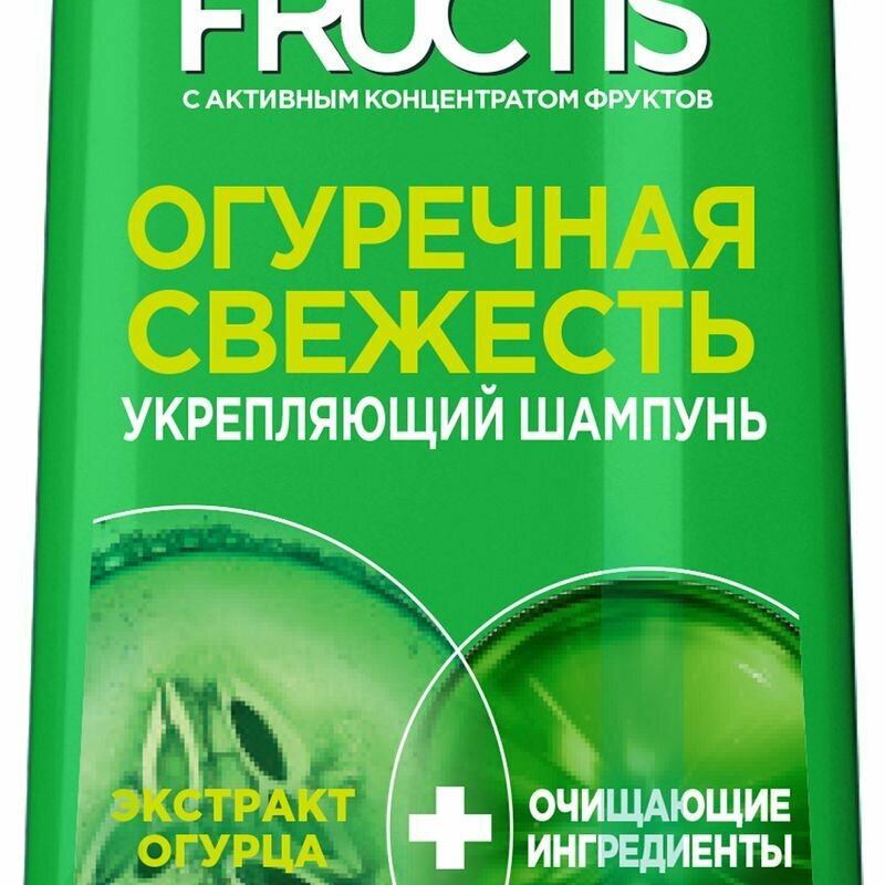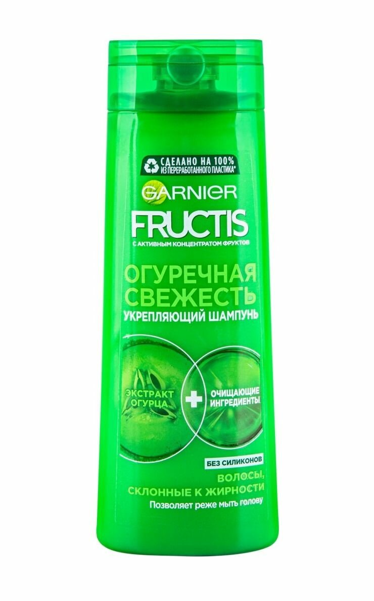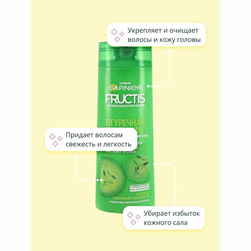 Уникальная формула Фруктис "Огуречная свежесть" без силиконов, обогащенная экстрактом огурца и витаминами B3$ B6, укрепляет и очищает кожу головы. Избыток кожного жира удаляется, волосы становятся чистыми, легкие от самых корней. Эффективный и бережный уход.