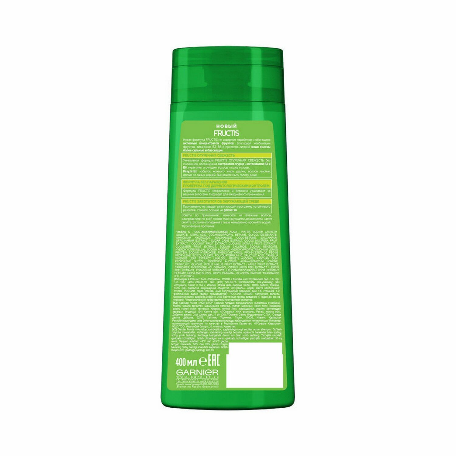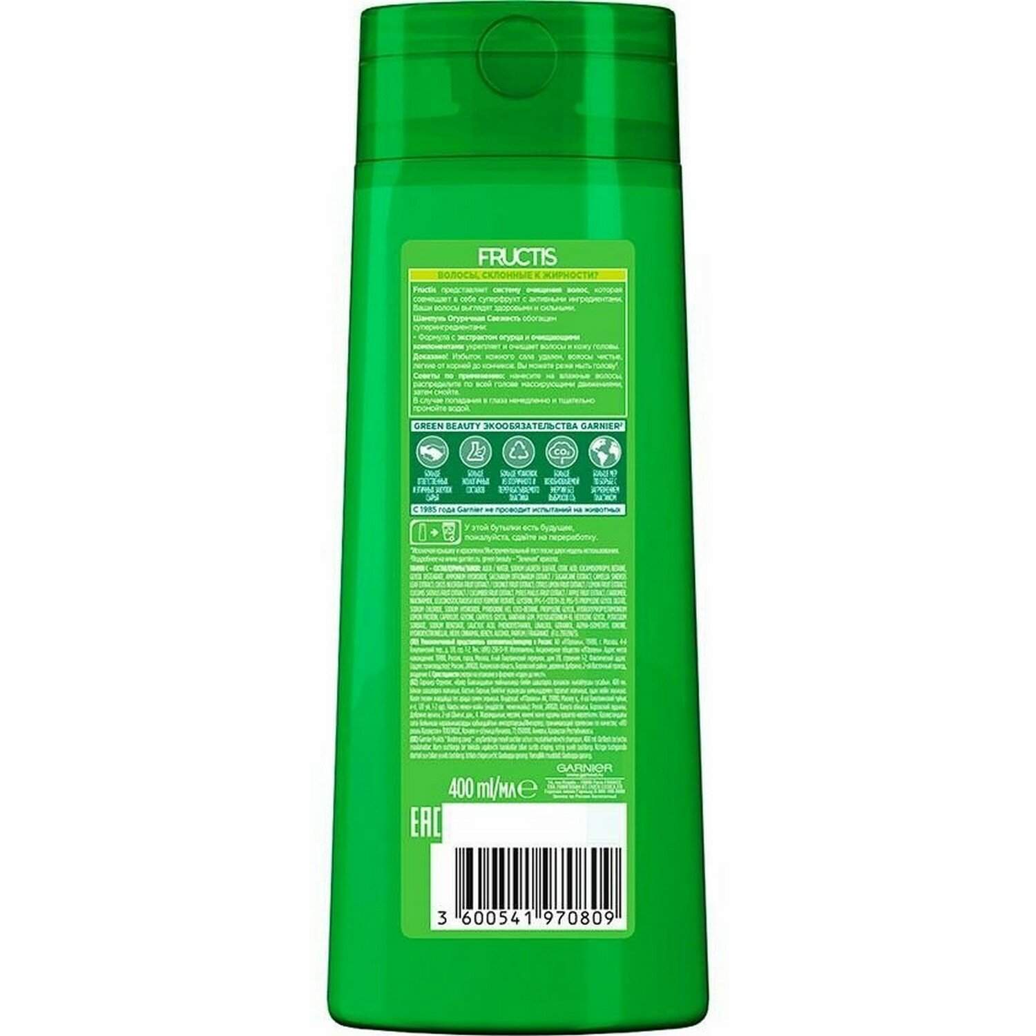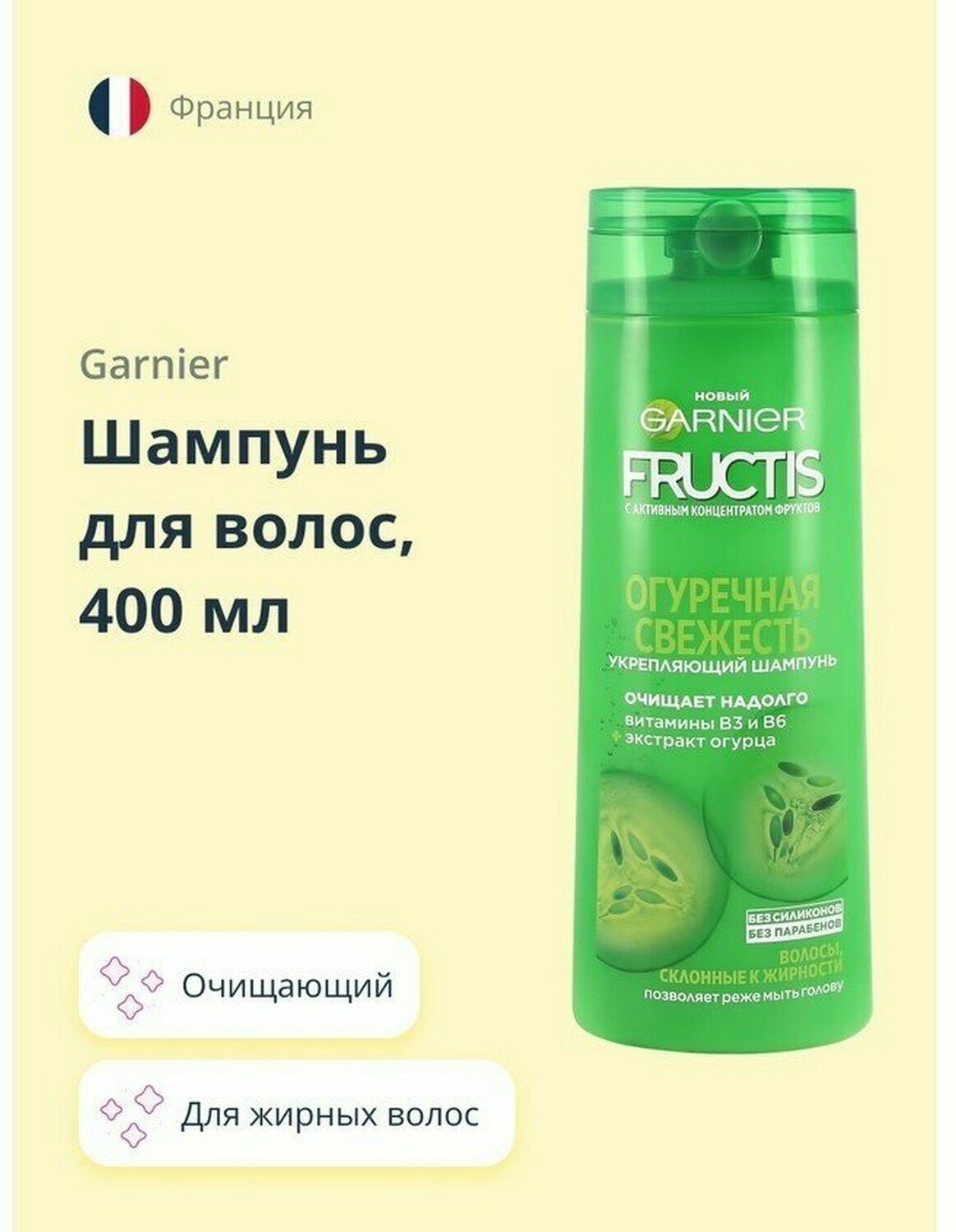 Уникальная формула Фруктис "Огуречная свежесть" без силиконов, обогащенная экстрактом огурца и витаминами B3$ B6, укрепляет и очищает кожу головы. Избыток кожного жира удаляется, волосы становятся чистыми, легкие от самых корней. Эффективный и бережный уход.