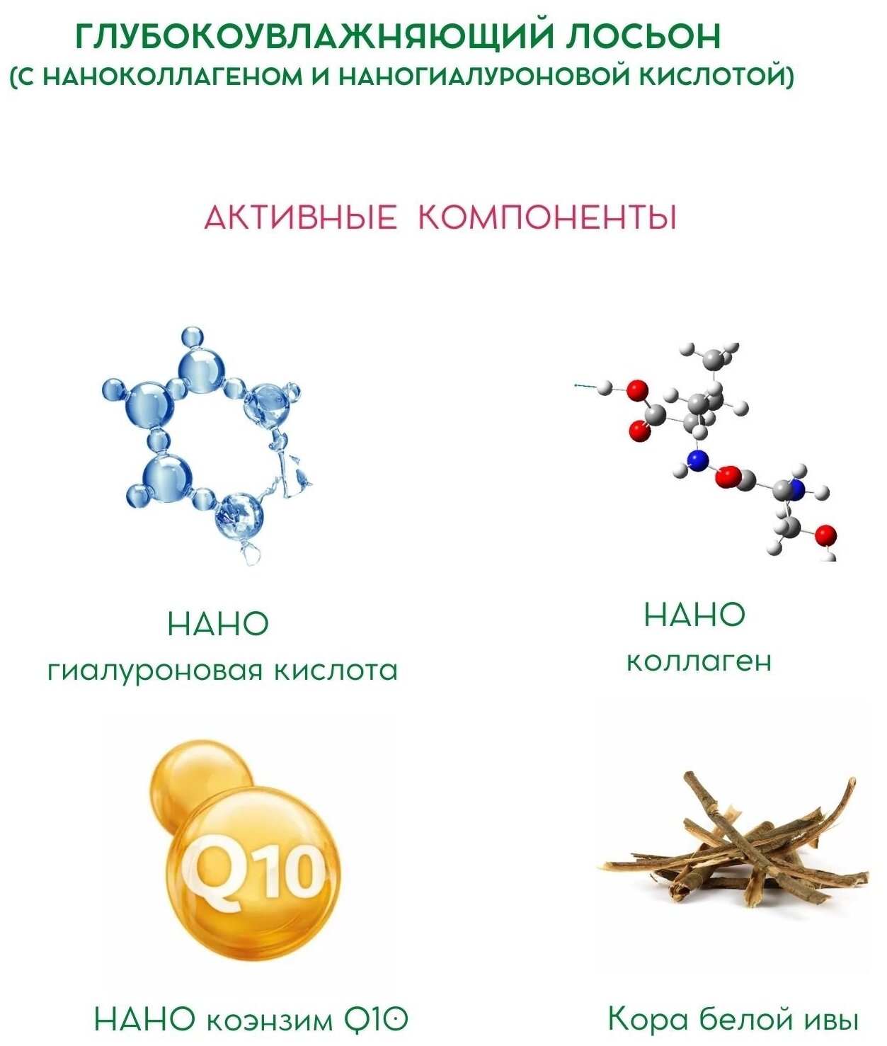 Глубокоувлажняющий лосьон содержит два активных компонента наноколлаген и наногиалуроновую кислоту. Лосьон глубоко увлажняет, активно подтягивает кожу, поддерживает оптимальный уровень влаги в клетках, придаёт коже упругость и эластичность. Наноколлаген и наногиалуроновая кислота обладают особыми свойствами, обеспечивая глубокое увлажнение и упругую сияющую кожу. Частица наногиалуроновой кислоты составляет сотуючасть от молекулы гиалуроновой кислоты. Она интенсивно проникает в клетки кожи, глубоко увлажняя ее. Частица наноколлагена составляет тридцатую часть от молекулы коллагена. Он придаёт коже упругость и эластичность. Экстракт коры белой ивы позволяет влаге более глубоко проникать в клетки кожи, активизирует кровообращение, улучшая снабжение кожи кислородом. Коэнзим Q10 антиоксидант,снабжает клетки кожи энергией,ускоряет их регенерацию.