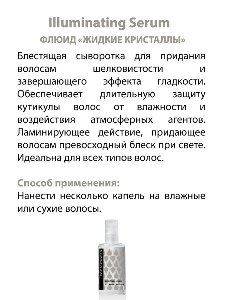 Способ применения: Нанести несколько капель на влажные или сухие волосы, равномерно распределить по длине.