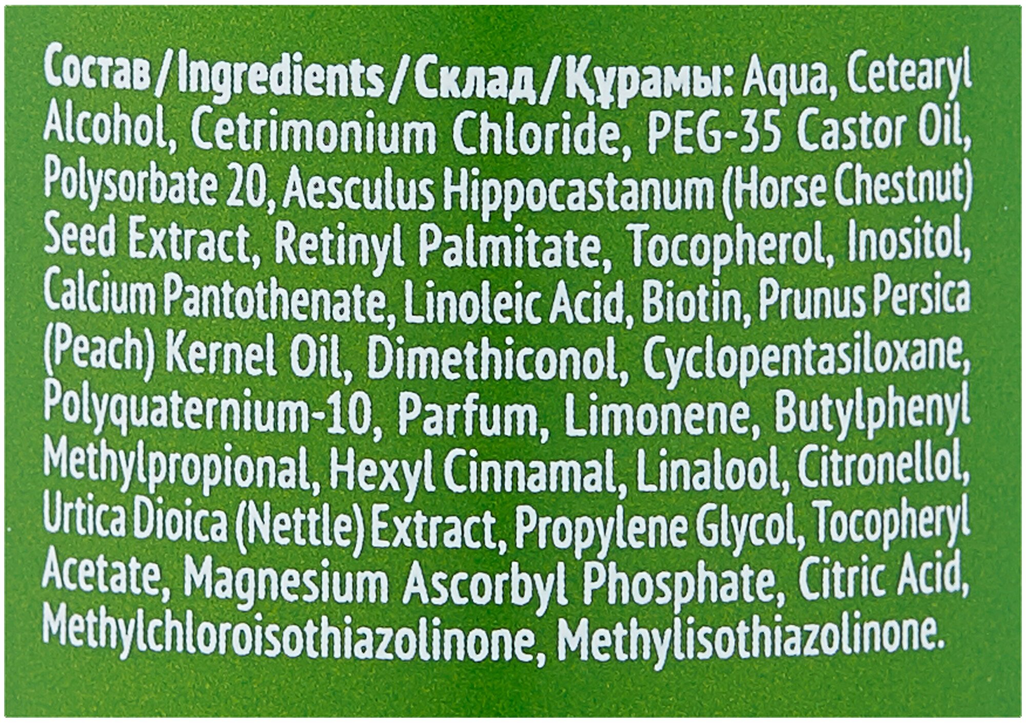| Состав | Aqua, Cetearyl Alcohol, Cetrimonium Chloride, PEG-35 Castor Oil, Polysorbate 20, Aesculus Hippocastanum (Horse Chestnut) Seed Extract, Retinyl Palmitate, Tocopherol, Inositol, Calcium Pantothenate, Linoleic Acid, Biotin, Prunus Persica (Peach) Kernel Oil, Dimethiconol, Dimethicone, Polyquaternium-10, Parfum, Limonene, Hexyl Cinnamal, Linalool, Urtica Dioica (Nettle) Extract, Propylene Glycol, Tocopheryl Acetate, Magnesium Ascorbyl Phosphate, Citric Acid, Methylchloroisothiazolinone, Methylisothiazolinone. |