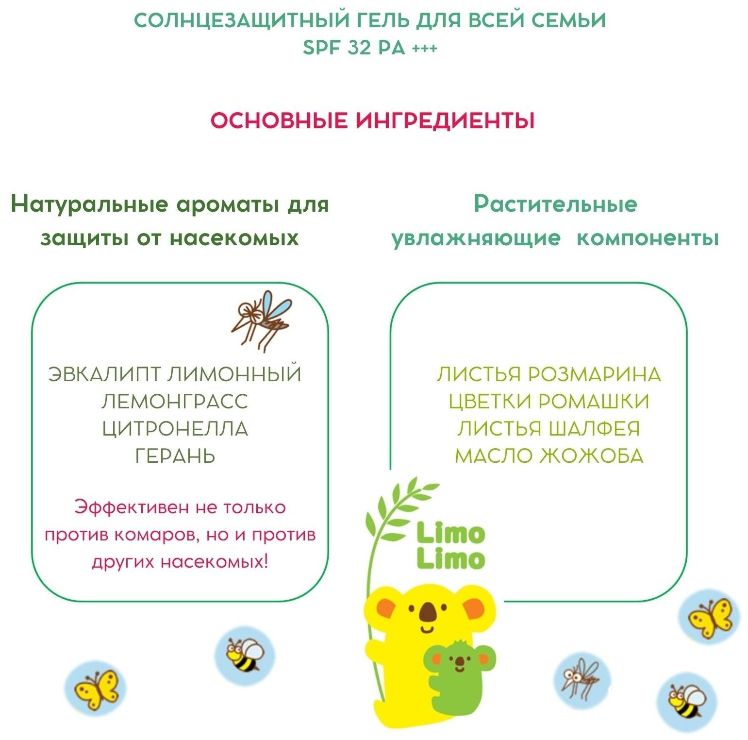 Гель для всей семьи имеет два свойства - защита от УФ - лучей и от насекомых на открытом воздухе. Увлажняет кожу, легко наносится, не создает липкую пленку. Прекрасно подходит для отдыха на природе. Содержит увлажняющие компоненты (экстракты листьев розмарина, жожоба, ромашки аптечной, шалфея лекарственного) и растительные компоненты с естественным запахом, отпугивающим насекомых (эвкалипт лимонный, лемонграсс, цитронелла, герань). Нежная защита кожи для всей семьи! Средство на водной основе, смывается обычным мылом или гелем для душа. Не содержит красителей, спирта, минеральных масел. Обладает ароматом зеленых цитрусов.