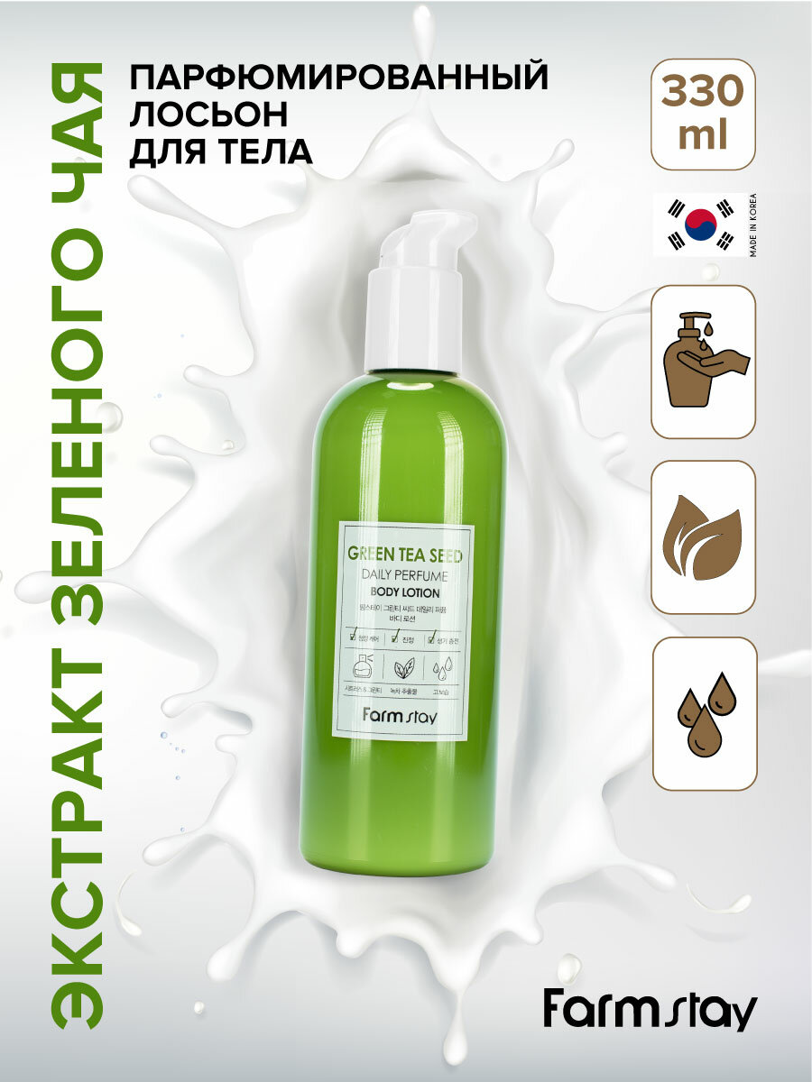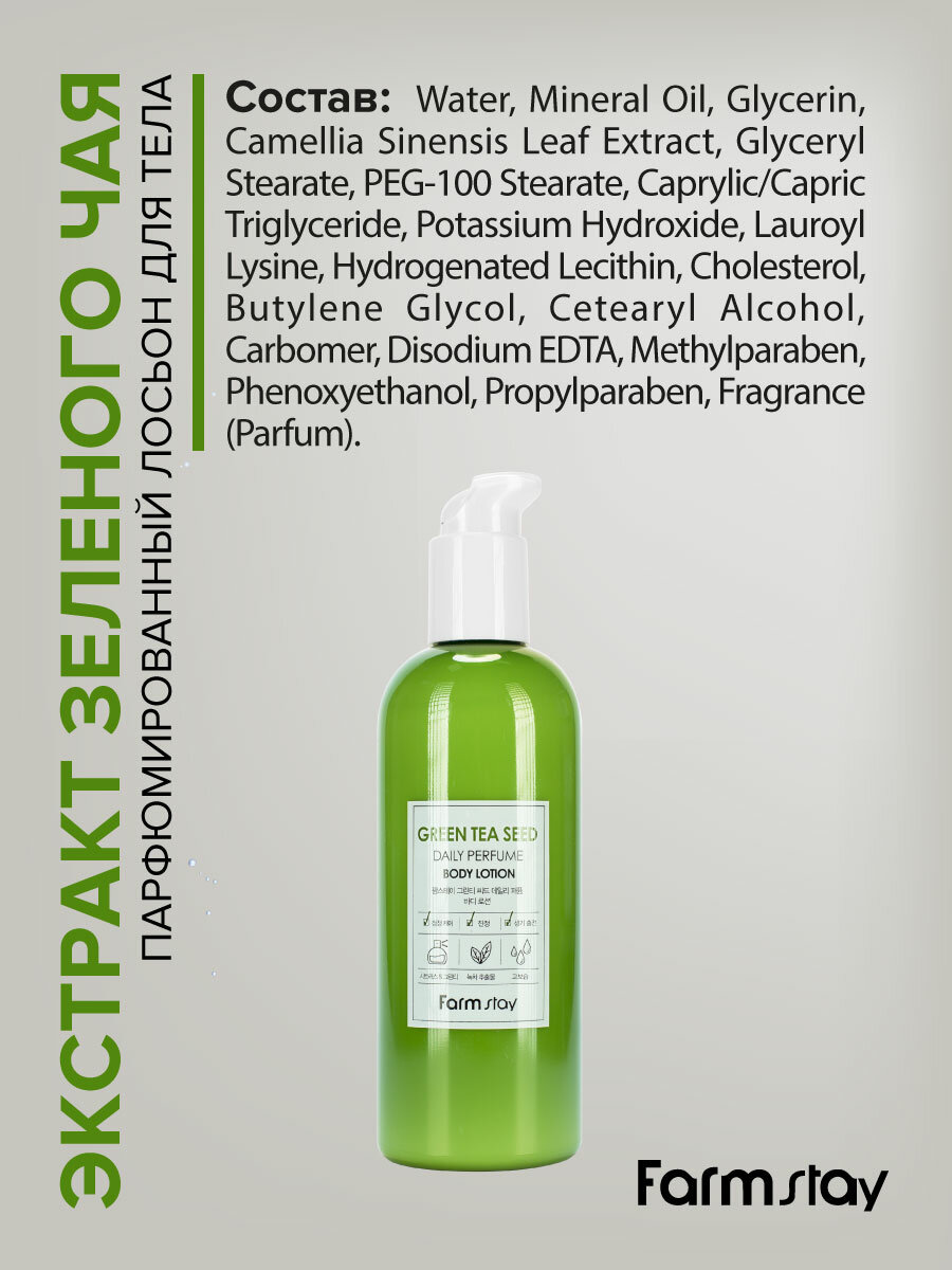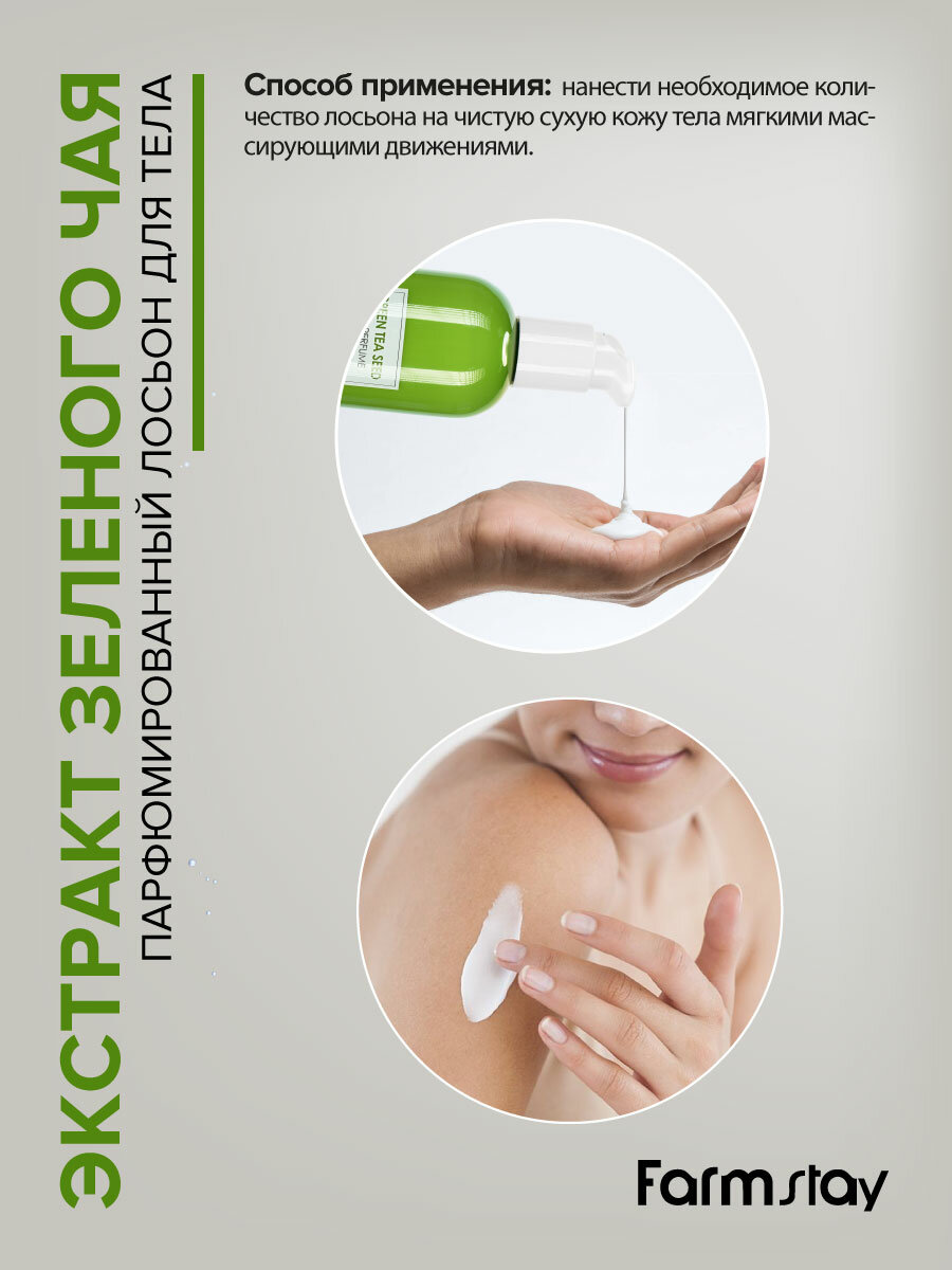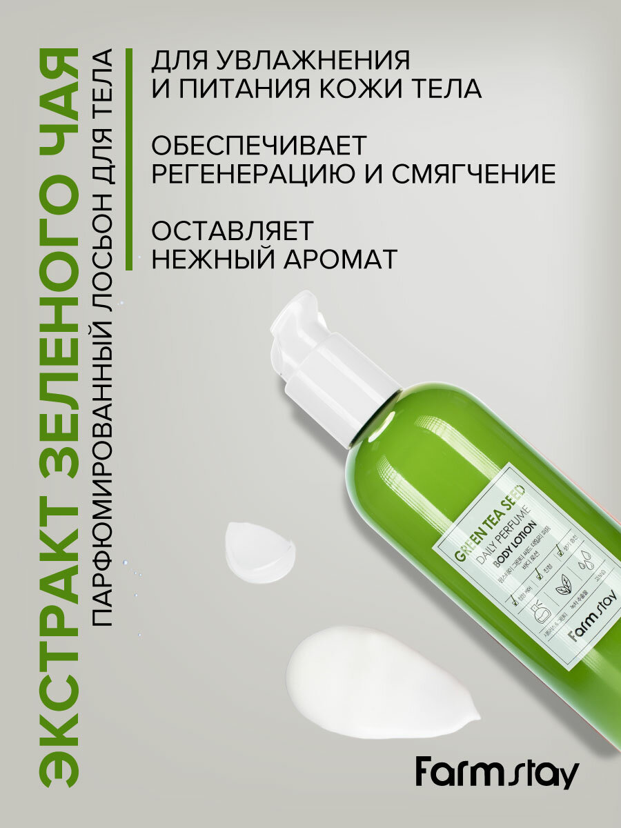 | Полное наименование | Парфюмированный лосьон для тела с экстрактом зеленого чая "Farmstay", 330 мл |