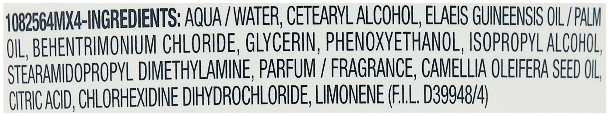 | Состав | aqua; cetearyl alcohol; elaeis guineensis oil/ palm oil; behentrimonium chloride; glycerin; phenoxyethanol; isopropyl alcohol; stearamidopropyl dimethylamine; parfum/fragrance; camellia oleifera seed oil; citric acid; chlorhexidine dihydrochloride; limonene |