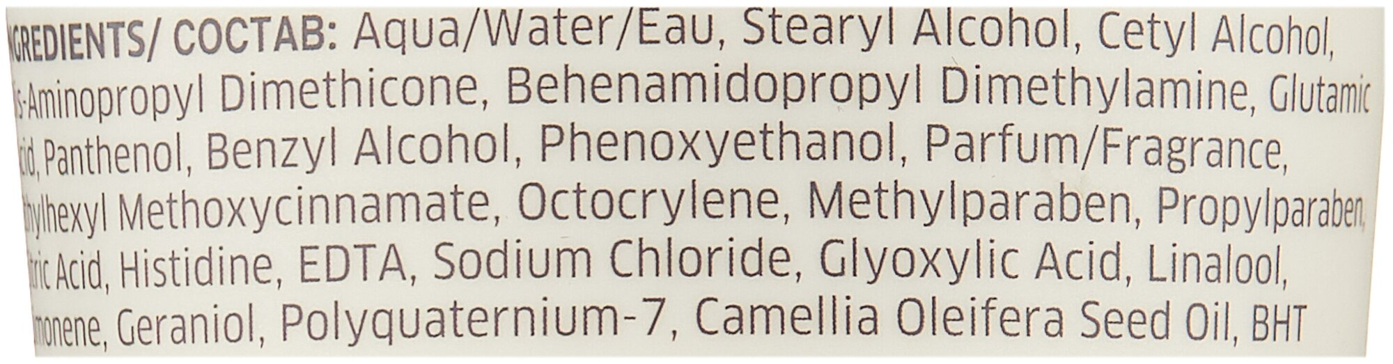 | Состав | Aqua/Water/Eau, Bis-Hydroxy/ Methoxy Amodimethicone, Stearyl Alcohol, Cetyl Alcohol, Stearamidopropyl Dimethylamine, Malic Acid, Parfum/Fragrance, Glutamic Acid, Panthenol, Benzyl Alcohol, Phenoxyethanol, Ethylhexyl Methoxycinnamate, Octocrylene, Dicetyldimonium Chloride, Methylparaben, Propylparaben, Histidine, Disodium EDTA, Propylene Glycol, Glyoxylic Acid, Sodium Chloride, Linalool, Limonene, Geraniol, Citronellol, Citric Acid, Persea Gratissima (Avocado) Oil, Trimethylsiloxysilicate, BHT |