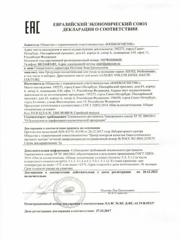 | Фирма-производитель | ООО "Юникосметик" |