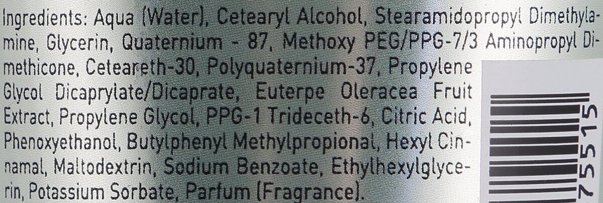 | Состав | aqua (water), cetearyl alcohol, stearamidopropyl dimethylamine, glycerin, quaternium-87, methoxy peg/ppg-7/3 aminopropyl dimethicone, ceteareth-30, polyquaternium-37, propylene glycol dicaprate/dicaprate, euterpe oleracea fruit extract, propylene glycol, ppg-1 trideceth-6, citric acid, phenoxyethanol, butylphenyl methylpropional, hexyl cinnamal, maltodextrin, sodium benzoate, ethylhexylglycerin, potassium sorbate, parfum (fragrance). |