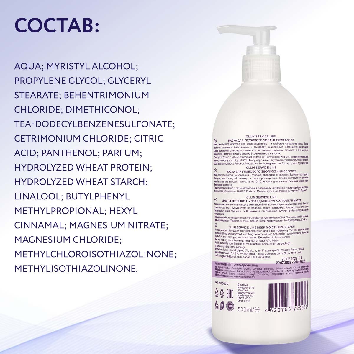 | Состав | Water, myristyl alcohol, propylene glycol, glyceryl stearate, behentrimonium chloride, dimethiconol, tea-dodecylbenzenesulfonate, cetrimonium chloride, citric acid, panthenol, parfum, hydrolyzed wheat protein, hydrolyzed wheat starch, linalool, butylphenyl methylpropional, hexyl cinnamal, magnesium nitrate, magnesium chloride, methylchloroisothiazolinone, methylisothiazolinone |