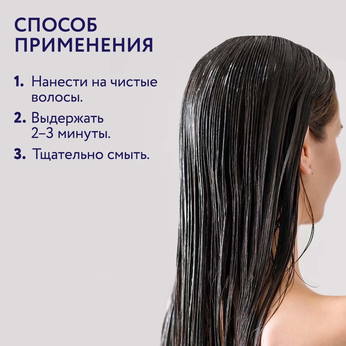Нанести на чистые, подсушенные полотенцем волосы, распределить по всей длине. Оставить на 2–3 минуты, смыть.