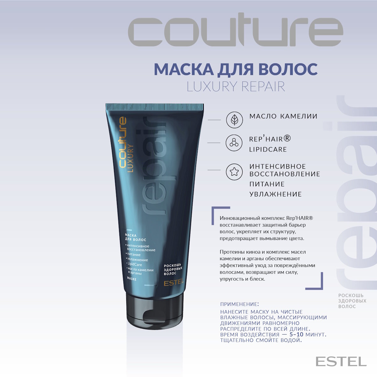 Маска LUXURY REPAIR обеспечивает интенсивное восстановление волос по всей длине. Эффективное возмещение утерянных липидов кутикулы и кортекса - благодаря биомиметическим комплексам мгновенного действия, максимальное увлажнение и блеск - благодаря маслу камелии.