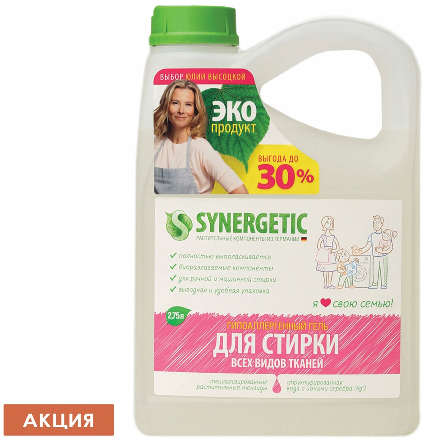 Покупать средства Synergetic в большой упаковке выгоднее и удобнее в хозяйстве! Это запас на 90 стирок, экономичной упаковки хватит на несколько месяцев использования.