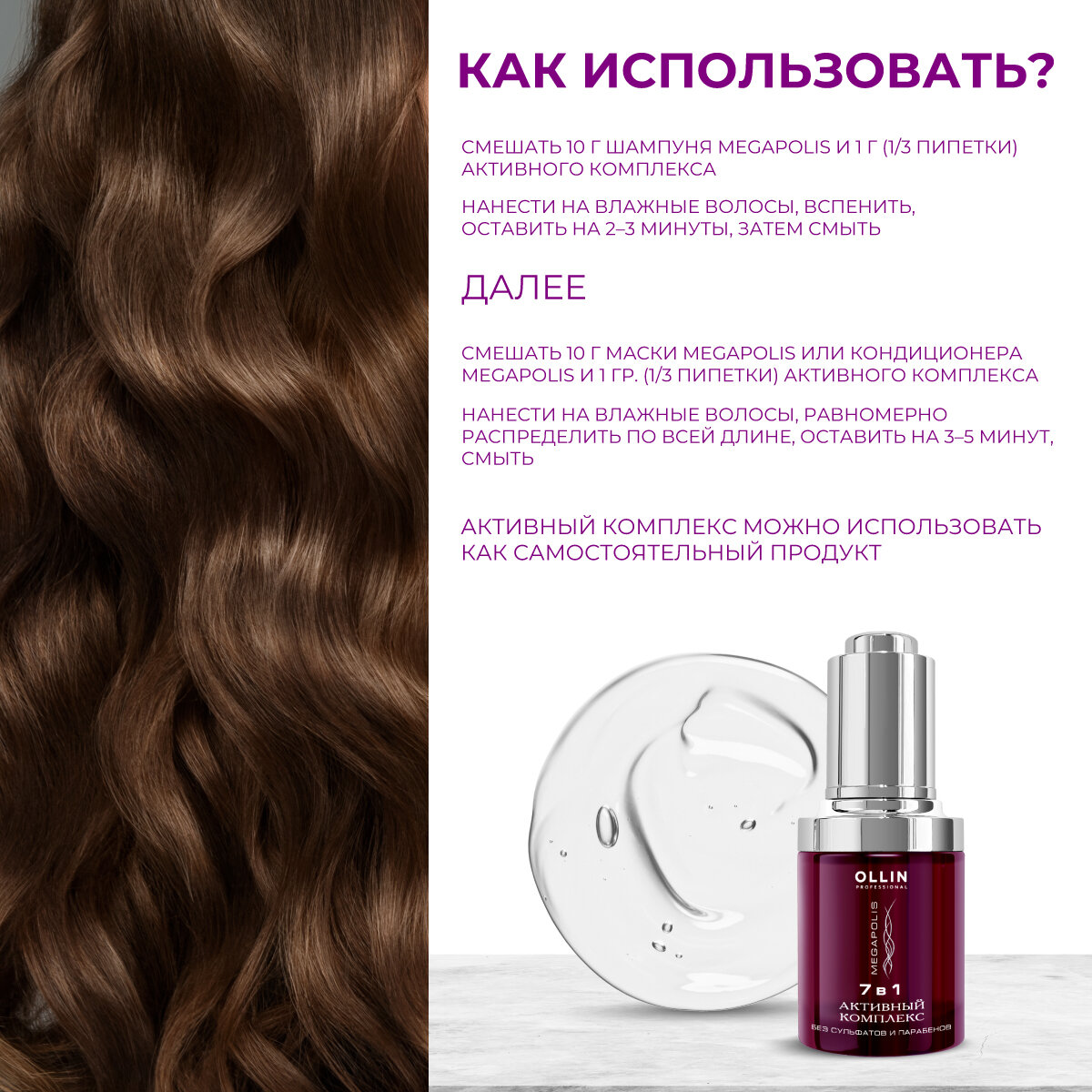 Смешать 10 г шампуня Megapolis и 1 г (1/3 пипетки) активного комплекса. Нанести на влажные волосы, вспенить, оставить на 2–3 минуты, затем смыть. Далее смешать 10 г маски Megapolis или кондиционера Megapolis и 1 гр. (1/3 пипетки) активного комплекса. Нанести на влажные волосы, равномерно распределить по всей длине, оставить на 3–5 минут, смыть. Затем на всю длину волос нанести Кристаллы Света Megapolis. Активный комплекс можно использовать как самостоятельный продукт.