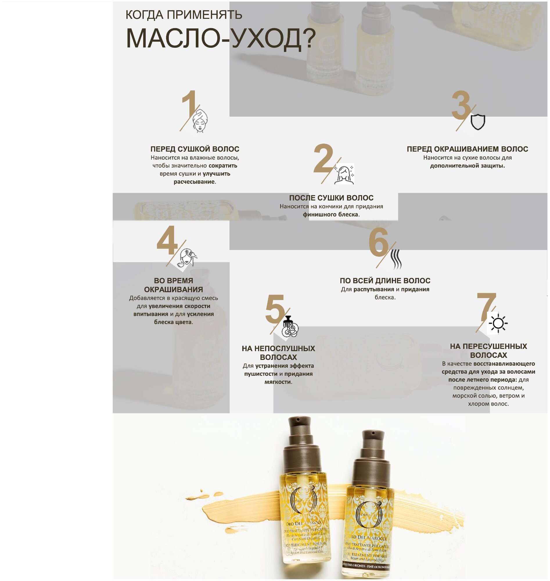 | Применение | перед укладкой:на влажные волосы нанести с рук несколько капель продукта по длине до кончиков как восстанавливающая и распутывающая процедура. Применение как финиш на сухие волосы:нанести с рук на кончики волос для эффекта блеска |