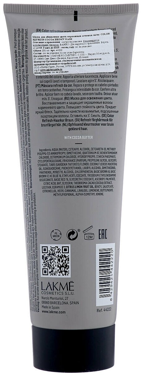 На сегодняшний день товар «Lakme Маска для обновления цвета коричневых оттенков волос 250 мл (Lakme ) (LAK44222)» можно купить с кешбеком в 1 магазине: Яндекс.Маркет