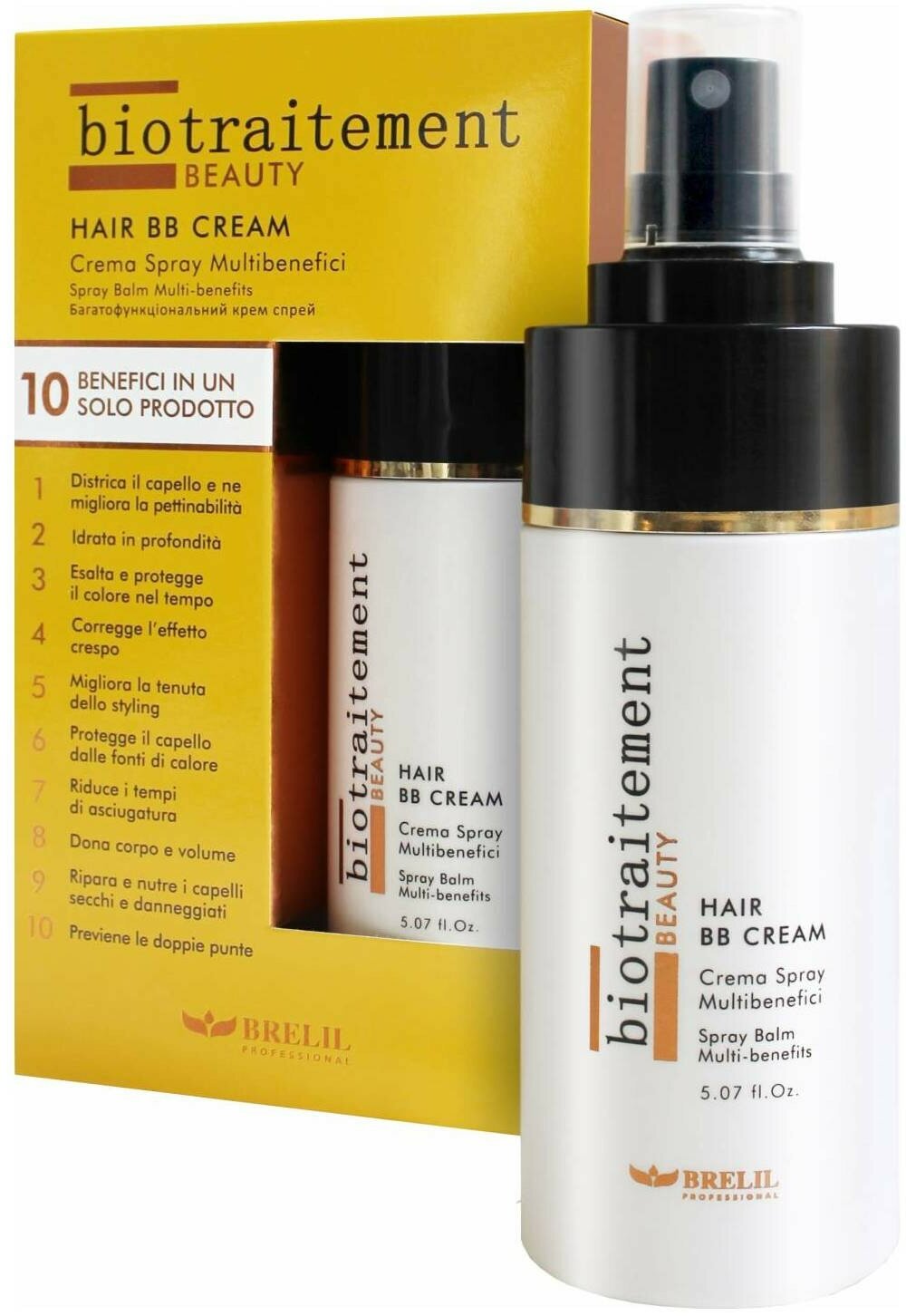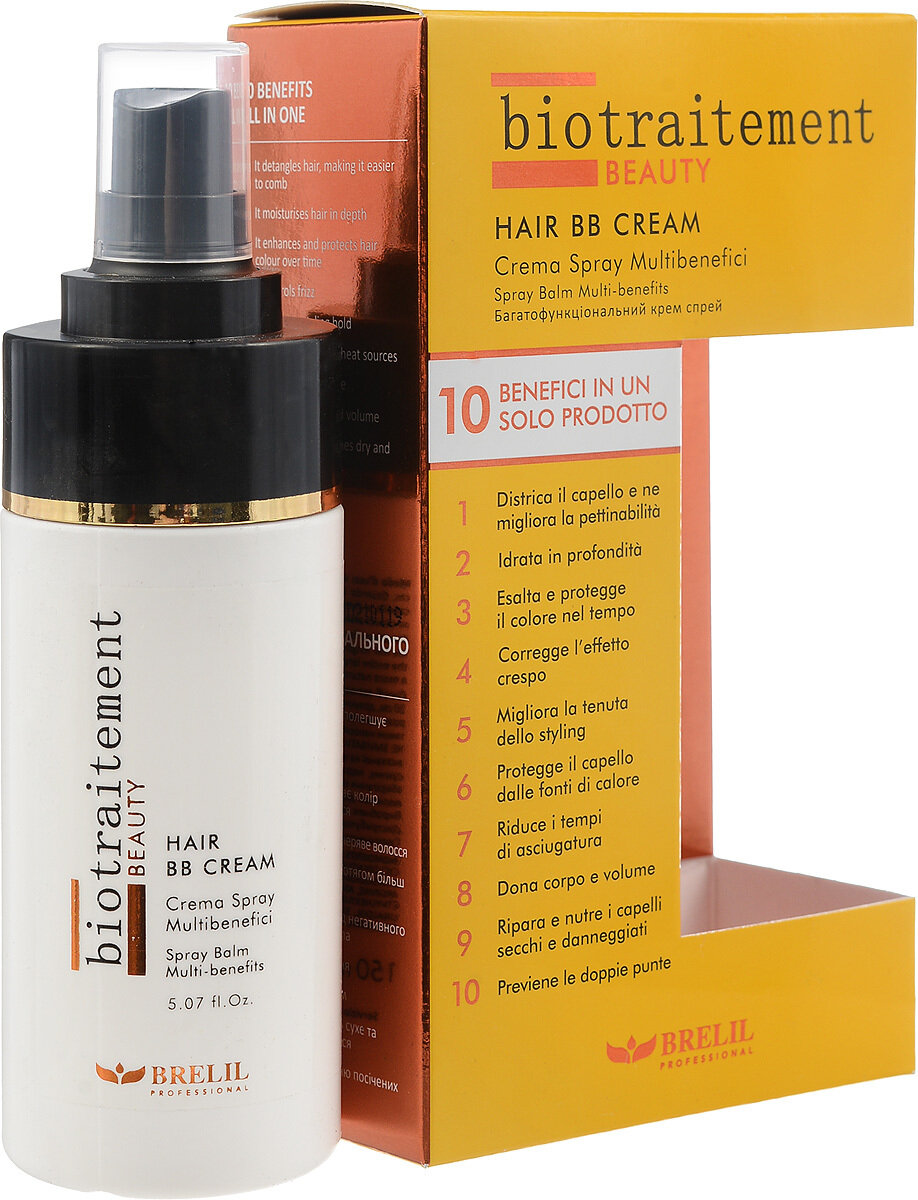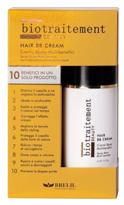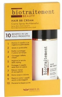 BB Cream Brelil Professional глубоко увлажняет сухие и поврежденные волосы, предотвращает появление секущихся кончиков. Облегчает расчесывание и распутывание волос, ускоряет процесс укладки волос и сохраняет ее на более длительный срок. Защищает волосы от агрессивного воздействия тепла. Придает дополнительный объем волосам. Укрепляет волосы и защищает цвет волос на более длительный срок. Предотвращает появление секущихся кончиков.
