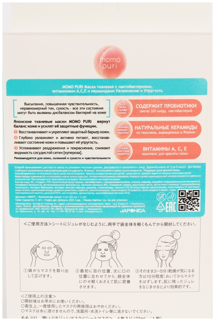 MOMO PURI Маска тканевая с лактобактериями витаминами АCE и керамидами Увлажнение и Упругость 4 шт (MOMO PURI ) (M088875)
