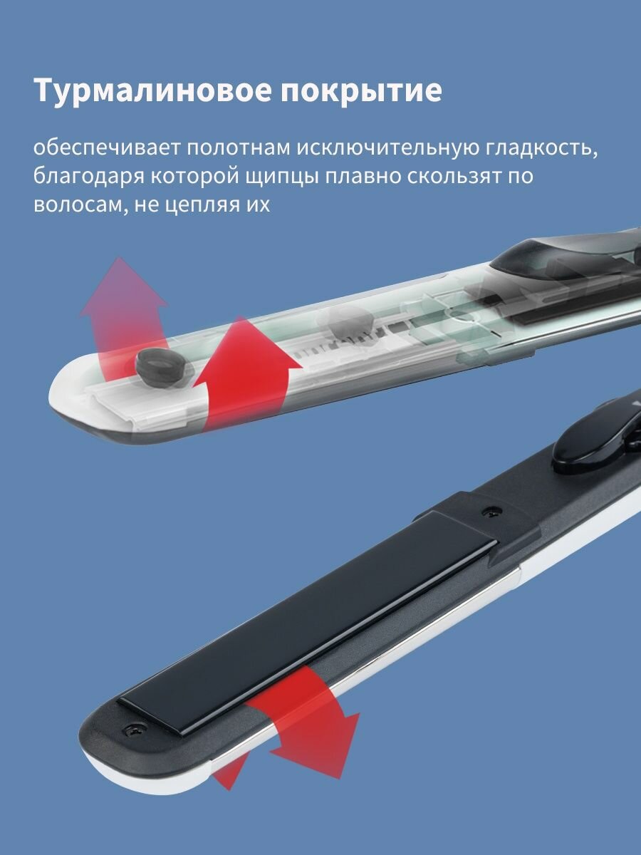 Турмалин позволяет создавать ионизацию, благотворно влияющую на структуру волоса, обеспечивая эластичность и снижение уровня электризации. Имеется удобный чехол для транспортировки и комфортного хранения изделия.
